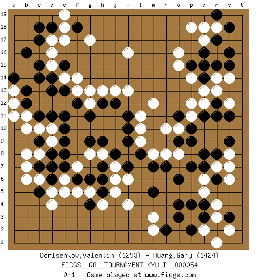 Last move : 0-1 2014 October 20 18:54:14 [Event "FICGS__GO__TOURNAMENT_KYU_I__000054"] [Site "FICGS"] [Date "2014.06.21"] [Round "1"] [Black "Denisenkov,Valentin"] [White "Huang,Gary"] [Result "0-1"] [Rating 1 "1293"] [Rating 2 "1424"] 1.q16 d16 2.q3 r14 3.r12 q12 4.q11 q13 5.r11 p11 6.p10 o10 7.o11 p12 8.o9 n10 9.p9 o16 10.r17 p18 11.s15 s14 12.r15 r18 13.s18 q17 14.r19 q18 15.s16 q5 16.o4 r3 17.r2 r4 18.r6 q6 19.q7 r7 20.r8 s7 21.q8 s8 22.s9 s6 23.s3 p3 24.p4 q2 25.q4 s2 26.p2 r1 27.o3 d4 28.g4 k4 29.g6 k6 30.d6 c6 31.c5 d5 32.c7 b6 33.d7 b7 34.c9 b8 35.d11 m3 36.o6 f5 37.f6 g5 38.h5 h4 39.h6 j5 40.c14 g17 41.b16 k16 42.c17 d17 43.d18 e18 44.c18 c8 45.d8 d9 46.e9 d10 47.e10 c10 48.c11 b10 49.e11 f13 50.k11 m12 51.j8 k13 52.h12 h13 53.p15 o15 54.e15 d15 55.d14 e14 56.q14 p14 57.q15 r13 58.j12 j13 59.l8 g12 60.g11 e6 61.e7 e5 62.f12 g13 63.e13 f14 64.d13 l10 65.k10 l9 66.k9 s12 67.s11 j7 68.h7 a13 69.b13 a12 70.a14 b11 71.b12 a11 72.f18 e19 73.c15 e17 74.n2 m2 75.m5 m8 76.k7 j6 77.m7 f7 78.e8 h8 79.h9 g8 80.g9 n8 81.n7 o8 82.p7 l11 0-1 Here are the names of the openings (joseki) played in the four corners : Corner q16 : q16 r14 Hoshi (Hwajeom, Seongjeom, Xingwei`) 4-4 Point. The star or hoshi (4-4) point, emphasizing influence at the potential expense of territory. Ikken Kakari (Hankan Keolch'im, Yi Gua`jiao~, 1-Space Low Approach). White 2 is the standard approach move to the 4-4. Corner d4 : d4 g4 Hoshi (Hwajeom, Seongjeom, Xingwei`) 4-4 Point. The star or hoshi (4-4) point, emphasizing influence at the potential expense of territory. Niken Takagakari (Dukan Nop'dakeolch'im, E`r Gaojia, 2-Space High Approach). Black 2 is a light approach move. Rarely played in even games, Black 2 is typically employed in handicap games. White continues with 6-4 or 3-10. In Korean Sunjang Baduk White has a stone on 8-4. Corner d16 : d16 d11 Hoshi (Hwajeom, Seongjeom, Xingwei`) 4-4 Point. The star or hoshi (4-4) point, emphasizing influence at the potential expense of territory. Player White won this Go (weiqi, baduk) game. Follow this game move after move (download)If you have lost four corners, resign. (Anonymous) Winning isn't everything... but losing is nothing. (Mednis)