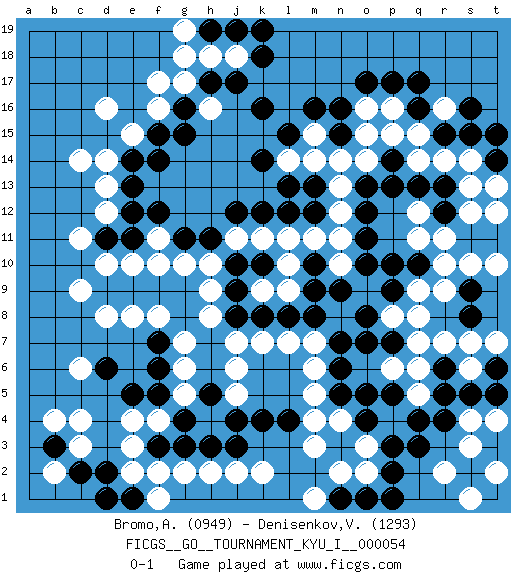 Last move : 0-1 2014 August 14 6:32:12 [Event "FICGS__GO__TOURNAMENT_KYU_I__000054"] [Site "FICGS"] [Date "2014.06.21"] [Round "1"] [Black "Bromo,Alexis"] [White "Denisenkov,Valentin"] [Result "0-1"] [Rating 1 "0949"] [Rating 2 "1293"] 1.q16 c4 2.q4 d16 3.k16 e3 4.k4 r10 5.q10 q11 6.p10 r11 7.q13 r7 8.r5 q9 9.p9 q8 10.p7 d10 11.f9 f11 12.h11 g10 13.g9 h10 14.j10 h9 15.j9 h8 16.g8 g7 17.f7 g6 18.f6 g5 19.f5 f4 20.e5 c6 21.d6 e8 22.e9 d8 23.d9 c9 24.g11 f8 25.j8 f10 26.f12 j11 27.j12 k11 28.k12 l11 29.l12 m11 30.m12 n11 31.o11 n12 32.o12 n13 33.o13 j7 34.k8 k7 35.l8 l7 36.m8 p8 37.o8 n14 38.n15 l14 39.k14 m15 40.m16 o15 41.n16 o14 42.p13 p16 43.p17 q15 44.r15 r16 45.q17 r14 46.s15 q14 47.r13 s14 48.s16 s13 49.r12 s12 50.o10 m5 51.n6 m6 52.n7 m3 53.n5 n4 54.o4 o3 55.p3 o2 56.p2 c14 57.e13 f17 58.g16 g17 59.h17 f16 60.f15 e15 61.f14 h16 62.g15 h18 63.j17 j18 64.k18 p6 65.o7 q6 66.r6 q7 67.o5 s6 68.s5 s7 69.p5 o16 70.o17 d12 71.e12 d13 72.e11 e10 73.l15 m14 74.n9 k2 75.l4 m4 76.j3 j2 77.h3 h2 78.g3 f2 79.f3 g2 80.g4 e4 81.h5 j5 82.j4 j6 83.t6 t7 84.t5 n10 85.m10 l10 86.m9 m7 87.k10 l9 88.t14 t13 89.t15 q5 90.r4 r2 91.q3 s3 92.s2 s1 93.t3 t2 94.o1 n2 95.n1 m1 96.p1 t4 97.s9 r9 98.s8 s10 99.t11 t10 100.c2 c3 101.d2 e2 102.b3 b4 103.e1 f1 104.d1 b2 105.d11 c11 106.e14 d14 107.j19 g18 108.h19 g19 109.k19 s4 110.p14 p15 111.l13 k9 112.m13 q12 113.s11 t12 0-1 Here are the names of the openings (joseki) played in the four corners : Corner q16 : q16 q11 Hoshi (Hwajeom, Seongjeom, Xingwei`) 4-4 Point. The star or hoshi (4-4) point, emphasizing influence at the potential expense of territory. Corner q4 : q4 r7 Hoshi (Hwajeom, Seongjeom, Xingwei`) 4-4 Point. The star or hoshi (4-4) point, emphasizing influence at the potential expense of territory. Niken Kakari (Dukan Keolch'im, E`r Gua`jiao~, 2-Space Low Approach). Black typically answers by 7-3 or 3-5 (which is not joseki). Player White won this Go (weiqi, baduk) game. Follow this game move after move (download)While the Baroque rules of chess could only have been created by humans, the rules of go are so elegant, organic, and rigorously logical that if intelligent life forms exist elsewhere in the universe, they almost certainly play go. (Edward Lasker, international chess master) You think that education is too expensive ? Try ignorance. (Derek Bok)