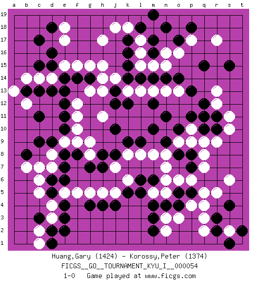 Last move : 1-0 2014 December 14 13:46:21 [Event "FICGS__GO__TOURNAMENT_KYU_I__000054"] [Site "FICGS"] [Date "2014.06.21"] [Round "1"] [Black "Huang,Gary"] [White "Korossy,Peter"] [Result "1-0"] [Rating 1 "1424"] [Rating 2 "1374"] 1.q15 d4 2.d6 c6 3.d5 c5 4.e4 d3 5.e3 d7 6.e7 d8 7.e8 q4 8.d9 e5 9.e6 f5 10.g4 g5 11.h4 e9 12.c9 c7 13.g7 h5 14.j4 j5 15.k5 j7 16.e10 f9 17.h8 k6 18.l5 f10 19.j8 k8 20.k9 l8 21.e11 f11 22.e12 h11 23.j10 g13 24.l9 m8 25.o8 n6 26.n4 m5 27.m4 p6 28.m6 n7 29.d16 n10 30.k12 g8 31.f8 g9 32.h7 h15 33.k15 d14 34.e14 e15 35.f14 f15 36.g14 h14 37.d15 g15 38.d13 c14 39.c17 b12 40.c13 b14 41.b13 a13 42.c11 f12 43.e13 k13 44.j13 j14 45.j12 h13 46.k14 l13 47.m12 m13 48.n11 n13 49.o10 n16 50.k17 h17 51.n18 p17 52.o17 o16 53.p18 l16 54.k16 m18 55.m17 l17 56.l18 k18 57.m19 j18 58.m16 l15 59.l14 m15 60.m14 n15 61.n14 o13 62.o14 e17 63.c15 r9 64.p13 r12 65.q12 r13 66.r11 s11 67.r10 s10 68.s15 q8 69.r3 q3 70.s4 s2 71.r2 q2 72.s1 s6 73.t2 n2 74.m2 n3 75.m3 o3 76.d18 e18 77.b8 b7 78.d2 c2 79.e2 c1 80.n9 n5 81.l6 r5 82.o4 p4 83.p7 q7 84.o5 o6 85.p5 q5 86.q10 p9 87.p8 p10 88.p11 q9 89.q11 o9 90.m10 n8 91.d1 r17 92.c3 1-0 Here are the names of the openings (joseki) played in the four corners : Corner d4 : d4 d6 Hoshi (Hwajeom, Seongjeom, Xingwei`) 4-4 Point. The star or hoshi (4-4) point, emphasizing influence at the potential expense of territory. Ikken Takagakari (Hankan Nop'dakeolch'im, Yi Gaojia, 1-Space High Approach). White typically responds at 6-4 or 3-10. White 4-10 is played when White finds play on the right side advantageous. White 4-8 or 3-8 may be played when White has support at top. Corner q4 : q4 l5 Hoshi (Hwajeom, Seongjeom, Xingwei`) 4-4 Point. The star or hoshi (4-4) point, emphasizing influence at the potential expense of territory. Corner d16 : e11 f11 This joseki is unknown. A weak or weird move has probably been played in this corner. Corner q16 : q15 l13 Takamoku (Gomok, Gaomu`) 5-4 Point. The takamoku (high) point (5-4). With its emphasis on influence, the 5-4 point complements the 4-4 (hoshi) point in creating an influence-oriented fuseki. Player Black won this Go (weiqi, baduk) game. Follow this game move after move (download)Don't disturb symmetry. (Anonymous) Is not life a hundred times too short to bore ourselves ? (Friedrich Nietzsche)