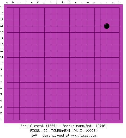 Last move : 1-0 2014 July 23 1:32:14 [Event "FICGS__GO__TOURNAMENT_KYU_I__000054"] [Site "FICGS"] [Date "2014.06.21"] [Round "1"] [Black "Beni,Clement"] [White "Boeckelmann,Raik"] [Result "1-0"] [Rating 1 "1369"] [Rating 2 "0746"] 1.r16 1-0 This go game has been lost on time (started : 2014.06.21 7:26:23) Here are the names of the openings (joseki) played in the four corners : Player Black won this Go (weiqi, baduk) game. Follow this game move after move (download)In the sound of the stone you can hear its purpose. (Pierre Audouard) The mind is like a parachute, it only functions when its open. (Unknown)