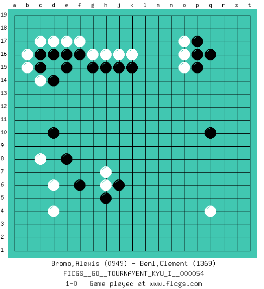 Last move : 1-0 2014 August 31 18:30:51 [Event "FICGS__GO__TOURNAMENT_KYU_I__000054"] [Site "FICGS"] [Date "2014.06.21"] [Round "1"] [Black "Bromo,Alexis"] [White "Beni,Clement"] [Result "1-0"] [Rating 1 "0949"] [Rating 2 "1369"] 1.q16 d4 2.d16 q4 3.q10 c14 4.f6 d6 5.e8 c8 6.d10 f17 7.e15 c17 8.c16 d17 9.e16 e17 10.f16 b16 11.d14 b15 12.c15 o17 13.p17 o16 14.p16 o15 15.p15 g16 16.g15 h16 17.h15 j16 18.j15 k16 19.k15 h7 20.j6 h6 21.h5 1-0 This go game has been lost on time (started : 2014.06.21 7:26:23) Here are the names of the openings (joseki) played in the four corners : Corner d16 : d16 c14 Hoshi (Hwajeom, Seongjeom, Xingwei`) 4-4 Point. The star or hoshi (4-4) point, emphasizing influence at the potential expense of territory. Ikken Kakari (Hankan Keolch'im, Yi Gua`jiao~, 1-Space Low Approach). White 2 is the standard approach move to the 4-4. Corner d4 : d4 f6 Hoshi (Hwajeom, Seongjeom, Xingwei`) 4-4 Point. The star or hoshi (4-4) point, emphasizing influence at the potential expense of territory. Corner q16 : q16 o17 Hoshi (Hwajeom, Seongjeom, Xingwei`) 4-4 Point. The star or hoshi (4-4) point, emphasizing influence at the potential expense of territory. Ikken Kakari (Hankan Keolch'im, Yi Gua`jiao~, 1-Space Low Approach). White 2 is the standard approach move to the 4-4. Player Black won this Go (weiqi, baduk) game. Follow this game move after move (download)Go is not a blocking game, it's a game of action. (Pierre Audouard) Inventor: A person who makes an ingenious arrangement of wheels, levers and springs, and believes it civilization. (Ambrose Bierce, The Devil's Dictionary)
