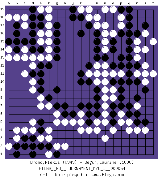 Last move : 0-1 2014 October 28 19:54:28 [Event "FICGS__GO__TOURNAMENT_KYU_I__000054"] [Site "FICGS"] [Date "2014.06.21"] [Round "1"] [Black "Bromo,Alexis"] [White "Segur,Laurine"] [Result "0-1"] [Rating 1 "0949"] [Rating 2 "1090"] 1.q16 d4 2.d16 q4 3.q10 d10 4.k16 k4 5.k10 c13 6.f12 d12 7.d14 c14 8.c15 b15 9.b16 b13 10.g9 r7 11.r8 r15 12.r16 r13 13.r12 s16 14.s17 s14 15.q14 r14 16.q13 s12 17.s11 r11 18.q12 s10 19.r10 t11 20.q11 s11 21.s9 t15 22.q7 p17 23.q17 p18 24.q18 m17 25.l17 n16 26.m16 p15 27.q15 m18 28.p16 o16 29.o15 p14 30.o14 l18 31.k18 k19 32.j19 l19 33.j18 n19 34.p19 o19 35.q19 n5 36.l7 g5 37.h6 g6 38.g7 e7 39.f8 e8 40.e9 d9 41.e10 h5 42.j6 e13 43.e14 f13 44.g13 f14 45.g14 f15 46.g15 e15 47.d15 f17 48.e17 f18 49.e18 e16 50.d17 e19 51.d19 f19 52.g16 f16 53.g17 c18 54.d18 c17 55.a15 a14 56.b14 a13 57.b15 a18 58.b17 b18 59.e12 d13 60.r6 n7 61.m8 o8 62.p8 o9 63.p9 n10 64.o10 n9 65.m9 o11 66.p10 n12 67.p13 l11 68.k11 r4 69.r5 s4 70.s5 m5 71.m6 p6 72.q6 q5 73.l10 m10 74.l12 m11 75.n13 m12 76.m13 k6 77.l6 k5 78.k7 j5 79.h7 n6 80.p7 f7 81.d11 c11 82.e11 n15 83.m15 n14 84.m14 n17 85.c3 c4 86.d3 e3 87.e2 b3 88.d2 f3 89.f2 g2 90.b2 c1 91.c2 b4 92.g1 h2 93.e4 f4 94.e5 d5 95.d1 f1 96.b1 a2 97.o12 p11 98.p12 n11 99.o7 n8 100.o6 p5 101.o5 o4 102.l5 l4 103.n4 n3 104.m7 m4 0-1 Here are the names of the openings (joseki) played in the four corners : Corner d16 : d16 c13 Hoshi (Hwajeom, Seongjeom, Xingwei`) 4-4 Point. The star or hoshi (4-4) point, emphasizing influence at the potential expense of territory. Niken Kakari (Dukan Keolch'im, E`r Gua`jiao~, 2-Space Low Approach). Black typically answers by 7-3 or 3-5 (which is not joseki). Corner d4 : d4 g9 Hoshi (Hwajeom, Seongjeom, Xingwei`) 4-4 Point. The star or hoshi (4-4) point, emphasizing influence at the potential expense of territory. Corner q16 : q16 r15 Hoshi (Hwajeom, Seongjeom, Xingwei`) 4-4 Point. The star or hoshi (4-4) point, emphasizing influence at the potential expense of territory. Player White won this Go (weiqi, baduk) game. Follow this game move after move (download)I really believe that Go is destined to take the place of Chess as the leading intellectual game of the Occident, just as it has reigned supreme in the Orient for some four thousand years. (Edward Lasker, international chess master) Control your own destiny or someone else will. (Jack Welch)