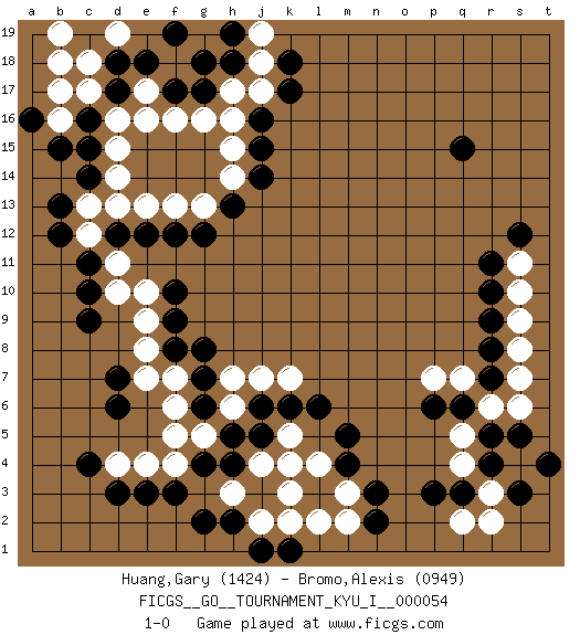 Last move : 1-0 2014 November 23 9:39:16 [Event "FICGS__GO__TOURNAMENT_KYU_I__000054"] [Site "FICGS"] [Date "2014.06.21"] [Round "1"] [Black "Huang,Gary"] [White "Bromo,Alexis"] [Result "1-0"] [Rating 1 "1424"] [Rating 2 "0949"] 1.q15 d4 2.d6 q4 3.c4 d16 4.d3 e4 5.e3 f4 6.f3 g3 7.g4 g5 8.h4 f5 9.h5 h3 10.j3 h6 11.g6 f6 12.g7 f7 13.f8 e7 14.d7 e8 15.f9 e9 16.c9 d10 17.c10 d11 18.f10 e10 19.b12 c12 20.b13 c13 21.d17 c17 22.c14 d14 23.c15 d15 24.c16 e17 25.d18 c18 26.e18 f18 27.f17 e16 28.g18 f16 29.g17 d19 30.f19 b16 31.b15 b18 32.a16 b17 33.c19 b19 34.c11 j4 35.j5 k4 36.h2 k5 37.j6 h7 38.g8 j7 39.k6 k7 40.l6 k3 41.g2 j2 42.m4 l2 43.n2 m3 44.n3 l4 45.m5 m2 46.j1 h3 47.k1 k2 48.d12 d13 49.e12 e13 50.f12 f13 51.g12 g13 52.h13 h14 53.j14 h15 54.j15 h16 55.j16 h17 56.h18 j17 57.k17 j18 58.h19 j19 59.k18 g16 60.r4 r3 61.q3 s4 62.r5 q2 63.p3 q5 64.s3 r2 65.s5 r6 66.q6 s6 67.t4 q7 68.p6 p7 69.r7 s7 70.r8 s8 71.r9 s9 72.r10 s10 73.r11 s11 74.s12 1-0 Here are the names of the openings (joseki) played in the four corners : Corner d4 : d4 d6 Hoshi (Hwajeom, Seongjeom, Xingwei`) 4-4 Point. The star or hoshi (4-4) point, emphasizing influence at the potential expense of territory. Ikken Takagakari (Hankan Nop'dakeolch'im, Yi Gaojia, 1-Space High Approach). White typically responds at 6-4 or 3-10. White 4-10 is played when White finds play on the right side advantageous. White 4-8 or 3-8 may be played when White has support at top. Corner q4 : q4 l6 Hoshi (Hwajeom, Seongjeom, Xingwei`) 4-4 Point. The star or hoshi (4-4) point, emphasizing influence at the potential expense of territory. Player Black won this Go (weiqi, baduk) game. Follow this game move after move (download)Ikken tobi is never wrong. (Anonymous) It's not a bug - it's an undocumented feature. (Anonymous)