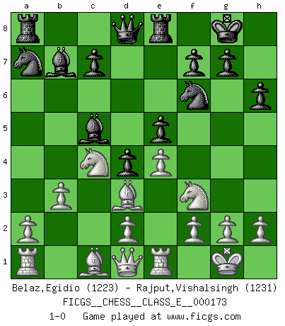 Last move : 1-0 2014 September 19 20:9:28 [Event "FICGS__CHESS__CLASS_E__000173"] [Site "FICGS"] [Date "2014.06.22"] [Round "1"] [White "Belaz,Egidio"] [Black "Rajput,Vishalsingh"] [Result "1-0"] [WhiteElo "1223"] [BlackElo "1231"] 1.e4 e5 2.Nf3 Nc6 3.Bc4 Bc5 4.O-O h6 5.Nc3 Nf6 6.Na4 Bd6 7.b3 O-O 8.Re1 a6 9.c3 b5 10.Nb2 Re8 11.Bd3 Bb7 12.c4 Bc5 13.cxb5 axb5 14.Bxb5 Na7 15.Bc4 d5 16.Bd3 d4 17.Nc4 1-0 This chess game has been lost on time (started : 2014.06.22 11:39:16) Giuoco Piano Kingside Castling by player White (move 4) Kingside Castling by player Black (move 7) Player White won this chess game. Follow this game move after move (download)Winning isn't everything... but losing is nothing. (Mednis) Herr Iljumschinow ist ein etwas merkwürdiger Geschäftsmann: Er arbeitet zusammen mit Leuten wie Muammar al-Gaddafi; früher ist das Saddam Hussein gewesen. (Joel Lautier) Entre mas años cumplo, mas valoro los Peones. (Keres) Psychologiquement, tu dois avoir confiance en toi même, mais cette confiance doit être basée sur des faits. (Robert Fischer) Ah, beer! The cause of, and the solution to, all of life's problems. (Homer Simpson)