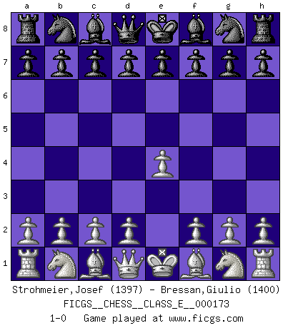 Last move : 1-0 2014 August 1 14:37:40 [Event "FICGS__CHESS__CLASS_E__000173"] [Site "FICGS"] [Date "2014.06.22"] [Round "1"] [White "Strohmeier,Josef"] [Black "Bressan,Giulio"] [Result "1-0"] [WhiteElo "1397"] [BlackElo "1400"] 1.e4 1-0 This chess game has been lost on time (started : 2014.06.22 11:39:16) King's pawn Opening Player White won this chess game. Follow this game move after move (download)Chess teaches you to control the initial excitement you feel when you see something that looks good and it trains you to think objectively when you're in trouble. (Stanley Kubrick) Man wirke der falschen Auffassung entgegen, als ob jeder Zug Unmittelbares zu leisten habe; auch Werte- und Ruhezüge haben ihre Existenzberechtigung. (Aaron Nimzowitsch) El Ajedrez es parte de la cultura, y si una cultura esta en decadencia, entonces también el Ajedrez declinará. (Mikhail Botvinnik) Aidez vos pièces, elles vous aideront. (Paul Morphy) We cannot be sure of having something to live for unless we are willing to die for it. (Ernesto Che Guevara)