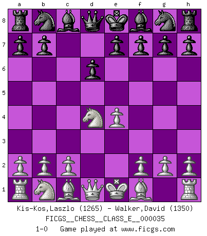 Last move : 1-0 2007 March 31 9:24:35 [Event "FICGS__CHESS__CLASS_E__000035"] [Site "FICGS"] [Date "2007.02.18"] [Round "1"] [White "Kis-Kos,Laszlo"] [Black "Walker,David"] [Result "1-0"] [WhiteElo "1265"] [BlackElo "1350"] 1.e4 c5 2.Nf3 d6 3.d4 cxd4 4.Nxd4 1-0 This chess game has been lost on time (started : 2007.02.18 21:42:55) Sicilian Player White won this chess game. Follow this game move after move (download)A bad day of Chess is better than any good day at work. (Anonymous) Es gibt Leute, die glauben, alles wäre vernünftig, was man mit einem ernsthaften Gesicht tut. (Georg Christoph Lichtenberg) Si un gobernante no entiende al Ajedrez, ¿como puede governar él un reinado?. (El Rey Khusros II) J'apprécie les joueurs d'est-indienne, c'est grâce à eux que je nourris ma famille depuis tant d'années. (Petrosian) Never risk one's whole fortune unless supported by one's entire army. (Niccolo Machiavelli)