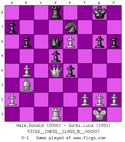 Last move : 0-1 2014 December 5 0:47:53 [Event "FICGS__CHESS__CLASS_B__000207"] [Site "FICGS"] [Date "2014.06.27"] [Round "1"] [White "Hale,Donald"] [Black "Sorbi,Luca"] [Result "0-1"] [WhiteElo "2000"] [BlackElo "1931"] 1.d4 Nf6 2.c4 g6 3.Nc3 Bg7 4.e4 d6 5.Nf3 O-O 6.Be2 e5 7.O-O Nc6 8.d5 Ne7 9.b4 Nh5 10.Re1 f5 11.Ng5 Nf6 12.Bf3 c6 13.Be3 h6 14.Ne6 Bxe6 15.dxe6 fxe4 16.Nxe4 Nxe4 17.Bxe4 d5 18.cxd5 cxd5 19.Bc2 e4 20.Rc1 b6 21.Bd4 Bxd4 22.Qxd4 Rc8 23.Bb3 Rxc1 24.Rxc1 Qd6 25.Rd1 Rd8 0-1 This chess game has been lost on time (started : 2014.06.27 13:5:8) King's Indian : Orthodox, Aronin-Taimanov variation (Yugoslav attack / Mar del Plata variation) Kingside Castling by player Black (move 5) Kingside Castling by player White (move 7) Player Black won this chess game. Follow this game move after move (download)Excellence at Chess is one mark of a scheming mind. (Sir Arthur Conan Doyle) Frage des Reporters: -Welche besonderen Umstände rechtfertigen das Anhalten der Uhren während einer Turnierpartie? Antwort: -Einen Fotographen zu strangulieren. (Siegbert Tarrasch) Un Peón pasado aumenta su poder a medida de que el número de piezas en el tablero disminuye. (Capablanca) Karpov est une pièce de musée. (Garry Kasparov) Games, world of games... There's always an opponent, and there's always a victim. (Revolver, movie)