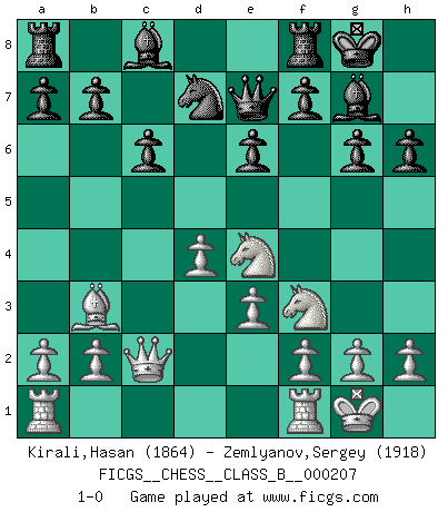 Last move : 1-0 2014 October 16 9:54:55 [Event "FICGS__CHESS__CLASS_B__000207"] [Site "FICGS"] [Date "2014.06.27"] [Round "1"] [White "Kirali,Hasan"] [Black "Zemlyanov,Sergey"] [Result "1-0"] [WhiteElo "1864"] [BlackElo "1918"] 1.d4 d5 2.c4 c6 3.Nf3 Nf6 4.Nc3 e6 5.Bg5 h6 6.Bxf6 Qxf6 7.e3 Nd7 8.Bd3 dxc4 9.Bxc4 g6 10.O-O Bg7 11.Qc2 Qe7 12.Ne4 O-O 13.Bb3 1-0 This chess game has been lost on time (started : 2014.06.27 13:5:8) QGD Slav : 4.Nc3 Kingside Castling by player White (move 10) Kingside Castling by player Black (move 12) Player White won this chess game. Follow this game move after move (download)A win by an unsound combination, however showy, fills me with artistic horror. (Wilhelm Steinitz) Fischer ist das größte Genie, das je vom Schachhimmel heruntergestiegen ist. (Mikhail Nekhemyevich Tal) ¿Quién es tu oponente esta tarde? Esta tarde mi oponente son las piezas negras. (Akiba Rubinstein) On a dit que l'homme se distingue de l'animal par le fait qu'il achète plus de livres qu'il ne peut en lire. Je voudrais suggérer qu'inclure à la liste des livres quelques livres d'échecs rendrait la distinction manifeste. (Edward Lasker) Do not put your faith in what statistics say until you have carefully considered what they do not say. (William W. Watt)