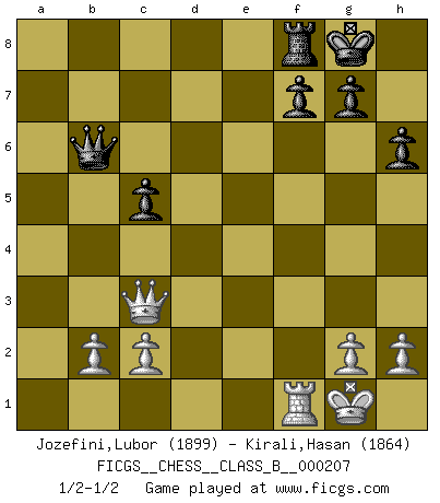 Last move : 1/2-1/2 2015 February 24 10:17:12 [Event "FICGS__CHESS__CLASS_B__000207"] [Site "FICGS"] [Date "2014.06.27"] [Round "1"] [White "Jozefini,Lubor"] [Black "Kirali,Hasan"] [Result "1/2-1/2"] [WhiteElo "1899"] [BlackElo "1864"] 1.e4 c5 2.Nf3 d6 3.d4 cxd4 4.Nxd4 Nf6 5.Nc3 a6 6.Bc4 e6 7.Bb3 b5 8.Qf3 Bb7 9.O-O Nbd7 10.Qg3 b4 11.Nd5 Nxe4 12.Qe3 Bxd5 13.Bxd5 exd5 14.f3 Ndc5 15.fxe4 dxe4 16.a3 a5 17.axb4 axb4 18.Bd2 b3 19.Nxb3 Rxa1 20.Rxa1 Be7 21.Nxc5 dxc5 22.Qxe4 O-O 23.Qe3 Bf6 24.Bc3 Bxc3 25.Qxc3 Qb6 26.Rf1 h6 1/2-1/2 Sicilian : Najdorf, Lipnitzky attack Kingside Castling by player White (move 9) Kingside Castling by player Black (move 22) This chess game ended in a draw. Follow this game move after move (download)Strategy requires thought, tactics require observation. (Max Euwe) Die Arbeit ist etwas Unnatürliches. Die Faulheit allein ist göttlich. (Anatole France) Un Peón pasado aumenta su poder a medida de que el número de piezas en el tablero disminuye. (Capablanca) Les pièces de l'échiquier étaient impitoyables. Elles le retenaient, elles l'absorbaient. Il y avait de l'horreur en cela, mais aussi une harmonie unique. Car, qu'y a-t-il dans le monde, à part les échecs ? (V. Nabokov) There is no instance of a country having benefited from prolonged warfare. (Sun Tzu)