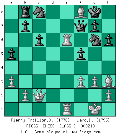 Last move : 1-0 2014 December 17 14:3:40 [Event "FICGS__CHESS__CLASS_C__000210"] [Site "FICGS"] [Date "2014.06.27"] [Round "1"] [White "Fierry Fraillon,David"] [Black "Ward,David"] [Result "1-0"] [WhiteElo "1778"] [BlackElo "1795"] 1.c4 f5 2.Nc3 e5 3.g3 Nc6 4.Bg2 Nf6 5.d3 Bb4 6.Bd2 O-O 7.Nf3 a5 8.O-O d6 9.Rc1 Ne7 10.a3 Bc5 11.e3 c6 12.d4 exd4 13.exd4 Ba7 14.Re1 d5 15.Qb3 h6 16.Re2 dxc4 17.Qxc4+ Kh7 18.Rce1 Ng6 19.Qb3 Bxd4 20.Nxd4 Qxd4 21.Be3 Qd6 22.Na4 Qe6 23.Qc2 Ne4 24.f3 Nd6 25.Bc5 Qf6 26.Nb6 Rb8 27.Nxc8 Nxc8 28.Re6 Qf7 29.Bh3 Kg8 30.Bxf8 1-0 This chess game has been lost on time (started : 2014.06.27 16:36:28) English : Anglo-Dutch defense Kingside Castling by player Black (move 6) Kingside Castling by player White (move 8) Player White won this chess game. Follow this game move after move (download)In the perfect Chess combination as in a first-rate short story, the whole plot and counter-plot should lead up to a striking finale, the interest not being allayed until the very last moment. (Yates and Winter) Ivan Sokolov treibt mich als Beifahrer an mit go Loeky go - . (Loek van Wely) Los problemas de Ajedrez exigen del compositor las mismas virtudes que caracterizan todo el arte de valor: originalidad, invención, concisión, armonía, complejidad e insinceridad explendida. (Vladimir Nabokov) Un journaliste : 'Vous préférez avoir une dame de plus sur l'échiquier ou au lit ?' Boris Spassky : 'Ca dépend de la position.' . 'gn is not allowed in chess unless n is an integer between 1 and 8 inclusive, where 1 and 8 are to interpreted as the standard numerals standing for integers in the ordered real-closed field R, with the *canonical* ordering. (As opposed to, say, an integer in the domain Z[2+i*sqrt(5)] or an integer in some exotic Grothendieck topos). (Normajean Yates)