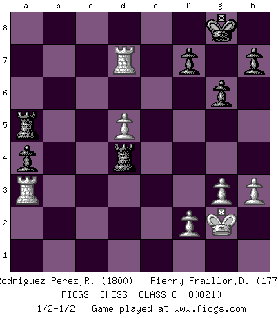 Last move : 1/2-1/2 2014 July 19 21:57:45 [Event "FICGS__CHESS__CLASS_C__000210"] [Site "FICGS"] [Date "2014.06.27"] [Round "1"] [White "Rodriguez Perez,Rene"] [Black "Fierry Fraillon,David"] [Result "1/2-1/2"] [WhiteElo "1800"] [BlackElo "1778"] 1.e4 c5 2.Nf3 d6 3.d4 cxd4 4.Qxd4 Nc6 5.Bb5 Bd7 6.Bxc6 Bxc6 7.c4 Nf6 8.Nc3 g6 9.O-O Bg7 10.Qd3 O-O 11.Nd4 Qb6 12.Rd1 Ng4 13.Qd2 Qc5 14.h3 Nf6 15.Qd3 Nd7 16.b3 Qe5 17.Ba3 Nc5 18.Bxc5 Qxc5 19.Rac1 Qa5 20.a4 Qb4 21.Nd5 Bxd5 22.exd5 Bxd4 23.Qxd4 Qxb3 24.Rb1 Qxa4 25.Rxb7 a5 26.Rc1 Rac8 27.Rxe7 Qb4 28.Qc3 Qxc3 29.Rxc3 a4 30.Rd7 Ra8 31.Ra3 Rfc8 32.Rxd6 Rxc4 33.Rd7 Rd4 34.g3 Ra5 35.Kg2 1/2-1/2 Sicilian, Chekhover variation Kingside Castling by player White (move 9) Kingside Castling by player Black (move 10) This chess game ended in a draw. Follow this game move after move (download)With or without the title, Bobby Fischer was unquestionably the greatest player of his time. (Burt Hochberg) Computer sind die einzigen Gegner, die nicht immer eine Ausrede auf Lager haben, wenn sie gegen mich verlieren. (Robert James Fischer) El Ajedrez lo es todo: arte, ciencia y deporte. (Anatoly Karpov) Les échecs, c'est la lutte contre l'erreur. (Johannes Zukertort) Thibault, I ask for draw. Game 13876. - Sorry Ilmars, you won. (FICGS chat)