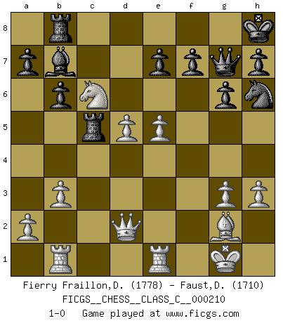 Last move : 1-0 2014 August 17 16:30:7 [Event "FICGS__CHESS__CLASS_C__000210"] [Site "FICGS"] [Date "2014.06.27"] [Round "1"] [White "Fierry Fraillon,David"] [Black "Faust,Dieter"] [Result "1-0"] [WhiteElo "1778"] [BlackElo "1710"] 1.c4 Nf6 2.Nf3 b6 3.g3 c5 4.Bg2 Bb7 5.O-O g6 6.Nc3 Bg7 7.d4 cxd4 8.Qxd4 Nc6 9.Qf4 O-O 10.Rd1 Nh5 11.Qd2 Nf6 12.Rb1 d6 13.b3 Qd7 14.Bb2 Rab8 15.Nd5 Nxd5 16.Bxg7 Kxg7 17.cxd5 Ne5 18.Qb2 Qf5 19.Nd4 Qf6 20.f4 Ng4 21.Qd2 Rfc8 22.e4 Rc5 23.Re1 Kh8 24.h3 Nh6 25.e5 dxe5 26.fxe5 Qg7 27.Nc6 1-0 English Opening Kingside Castling by player White (move 5) Kingside Castling by player Black (move 9) Player White won this chess game. Follow this game move after move (download)Chess is a forcing house where the fruits of character can ripen more fully than in life. (Edward Morgan Foster) Über Karpov: Er war und ist ein Vertreter der russischen Reaktionäre. Das steckt tief in seiner Seele, wehalb ich nicht nett mit ihm umgehen kann. (Viktor Kortschnoi) El Ajedrez es tan interesante por sí solo, que no es necesario un interés monetario para persuadir a una persona a que lo practique; por lo tanto, nunca se juega por dinero. (Benjamin Franklin) Il n'y a pas de prix trop élevé au scalp de l'ennemi. (Koblentz) You know what they say : You lie down with the Devil, you wake up in Hell. (Horatio Caine, C.S.I. Miami)
