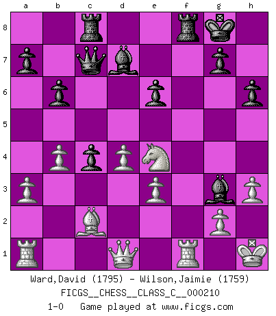 Last move : 1-0 2015 January 30 18:37:49 [Event "FICGS__CHESS__CLASS_C__000210"] [Site "FICGS"] [Date "2014.06.27"] [Round "1"] [White "Ward,David"] [Black "Wilson,Jaimie"] [Result "1-0"] [WhiteElo "1795"] [BlackElo "1759"] 1.e4 e6 2.d4 d5 3.Nd2 Nf6 4.Bd3 c5 5.e5 Nfd7 6.c3 Nc6 7.Ngf3 f6 8.exf6 Nxf6 9.O-O cxd4 10.cxd4 Bd6 11.Re1 O-O 12.Nf1 Qb6 13.a3 Bd7 14.b4 Rac8 15.Bb2 Na5 16.Ne3 Nc4 17.Nxc4 dxc4 18.Bc2 Nd5 19.Ng5 h6 20.Ne4 Qc7 21.h3 b6 22.Bc1 Bf4 23.Be3 Nxe3 24.fxe3 Bh2+ 25.Kh1 Bg3 26.Rf1 1-0 This chess game has been lost on time (started : 2014.06.27 16:36:28) French : Tarrasch, Closed variation Kingside Castling by player White (move 9) Kingside Castling by player Black (move 11) Player White won this chess game. Follow this game move after move (download)Chess is imagination. (David Bronstein) Wenn es im Universum noch irgendwo intelligente Lebewesen gibt, dann kennen sie Go. (Emanuel Lasker) Los problemas de Ajedrez exigen del compositor las mismas virtudes que caracterizan todo el arte de valor: originalidad, invención, concisión, armonía, complejidad e insinceridad explendida. (Vladimir Nabokov) Une platitude souvent récitée à propos des Echecs est qu'une des choses les plus difficiles à réaliser est de gagner une position gagnante. Cela ne manque pas de sens mais, pour ma part, j'ai toujours trouvé plus difficile de gagner une position perdante. (Tim Krabbe) Everything in life is luck. (Donald Trump)