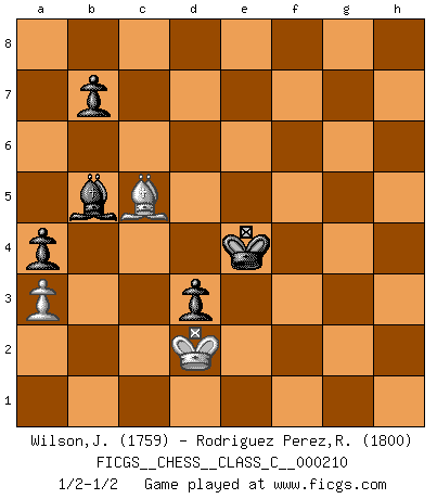 Last move : 1/2-1/2 2014 July 11 2:12:6 [Event "FICGS__CHESS__CLASS_C__000210"] [Site "FICGS"] [Date "2014.06.27"] [Round "1"] [White "Wilson,Jaimie"] [Black "Rodriguez Perez,Rene"] [Result "1/2-1/2"] [WhiteElo "1759"] [BlackElo "1800"] 1.d4 e6 2.c4 d5 3.Nc3 Nf6 4.cxd5 exd5 5.Bg5 Nbd7 6.e3 c6 7.Bd3 Be7 8.Nf3 Ne4 9.Bf4 f5 10.Qc2 O-O 11.h3 Ndf6 12.Ne5 Bd6 13.O-O Qe7 14.Ne2 Nh5 15.Bh2 a5 16.Kh1 Be6 17.f3 Ng5 18.g4 fxg4 19.hxg4 Bxe5 20.dxe5 Nxf3 21.Bxh7+ Kh8 22.Nf4 Nxf4 23.Rxf3 g6 24.Rxf4 Rxf4 25.exf4 Qxh7 26.Rg1 Rf8 27.Qf2 d4 28.Rg3 Bd5+ 29.Kg1 c5 30.Qf1 Kg8 31.Rh3 Qd7 32.Qd3 Rf7 33.Rh4 Rg7 34.b3 Be6 35.Qh3 Rh7 36.Rxh7 Qxh7 37.Qxh7+ Kxh7 38.Kf2 Bxg4 39.Bg3 g5 40.fxg5 Kg6 41.e6 Bxe6 42.Bd6 c4 43.bxc4 Bxc4 44.a3 Kxg5 45.Bc7 a4 46.Bb6 d3 47.Ke3 Kf5 48.Kd2 Ke4 49.Bc5 Bb5 1/2-1/2 Queen's pawn Kingside Castling by player Black (move 10) Kingside Castling by player White (move 13) 10 pieces endgame at move 43 : White KBPPP , Black KBPPP WHITE : King + 1 Bishop 3 Pawns BLACK : King + 1 Bishop 3 Pawns 9 pieces endgame at move 43 : White KBPP , Black KBPPP WHITE : King + 1 Bishop 2 Pawns BLACK : King + 1 Bishop 3 Pawns 8 pieces endgame at move 44 : White KBP , Black KBPPP WHITE : King + 1 Bishop 1 Pawn BLACK : King + 1 Bishop 3 Pawns This chess game ended in a draw. Follow this game move after move (download)I played Chess with him and would have beaten him sometimes only he always took back his last move, and ran the game out differently. (Mark Twain) Gewöhnliche Menschen denken nur daran, wie sie ihre Zeit verbringen. Ein intelligenter Mensch versucht, sie auszunutzen. (Arthur Schopenhauer) Todo lo que importa ante el tablero de Ajedrez son buenas jugadas. (Bobby Fischer) Le thème de l'attaque double intervient d'une manière ou d'une autre dans l'immense majorité des combinaisons. (Youri Averbakh) Mac users swear by their computers. PC users swear at their computers. (Author unknown)