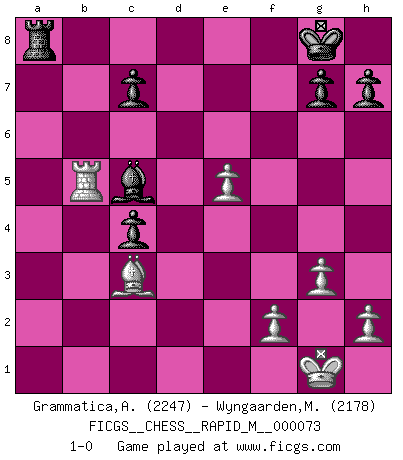 Last move : 1-0 2014 November 17 22:55:51 [Event "FICGS__CHESS__RAPID_M__000073"] [Site "FICGS"] [Date "2014.06.29"] [Round "1"] [White "Grammatica,Andrea"] [Black "Wyngaarden,Martin"] [Result "1-0"] [WhiteElo "2247"] [BlackElo "2178"] 1.d4 Nf6 2.c4 e6 3.g3 d5 4.Nf3 dxc4 5.Bg2 a6 6.O-O Nc6 7.e3 Bd7 8.Qe2 b5 9.b3 cxb3 10.axb3 Be7 11.Bb2 O-O 12.Rc1 Nb4 13.Ne5 Nfd5 14.Na3 Be8 15.Nc2 a5 16.Nxb4 Bxb4 17.Qc2 Bd6 18.Nc6 Bxc6 19.Qxc6 Qb8 20.Bxd5 exd5 21.Qxd5 a4 22.bxa4 Rxa4 23.e4 Rd8 24.Qc6 Qa8 25.Rab1 Rc4 26.Qxa8 Rxa8 27.Rxc4 bxc4 28.Bc3 f6 29.e5 fxe5 30.dxe5 Bc5 31.Rb5 1-0 This chess game has been lost on time (started : 2014.06.29 0:4:56) Catalan Opening Kingside Castling by player White (move 6) Kingside Castling by player Black (move 11) Player White won this chess game. Follow this game move after move (download)If cunning alone were needed to excel, women would be the best Chess players. (Albin) Das Schachspiel ist ein See, in welchem eine Mücke baden und ein Elefant ertrinken kann. (Emanuel Lasker) Solo los afeminados hacen el Enroque. (Rob Sillars) Il n'y a pas de prix trop élevé au scalp de l'ennemi. (Koblentz) Tomorrow's what you make of it. (Horatio Caine, C.S.I. Miami)