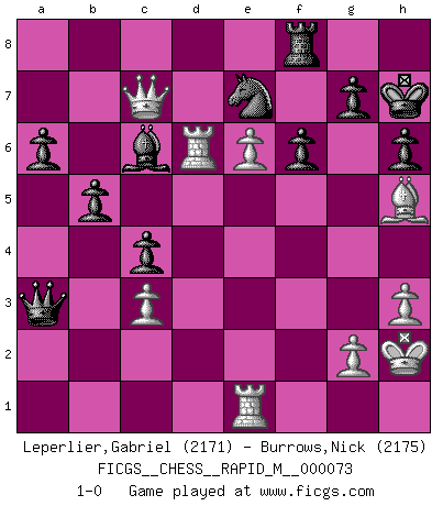 Last move : 1-0 2014 October 24 20:11:49 [Event "FICGS__CHESS__RAPID_M__000073"] [Site "FICGS"] [Date "2014.06.29"] [Round "1"] [White "Leperlier,Gabriel"] [Black "Burrows,Nick"] [Result "1-0"] [WhiteElo "2171"] [BlackElo "2175"] 1.d4 d5 2.c4 c6 3.Nf3 Nf6 4.Nc3 e6 5.e3 Nbd7 6.Qc2 Bd6 7.Bd3 O-O 8.O-O dxc4 9.Bxc4 b5 10.Bd3 Bb7 11.a3 h6 12.e4 e5 13.h3 Re8 14.Be3 a6 15.dxe5 Nxe5 16.Nxe5 Bxe5 17.f4 Bxc3 18.bxc3 Qe7 19.e5 Nd5 20.Bd2 Rad8 21.Rf2 Qc5 22.Re1 Qxa3 23.f5 f6 24.e6 c5 25.Be2 Bc6 26.Bh5 c4 27.Qe4 Ne7 28.Qh4 Rxd2 29.Rxd2 Rf8 30.Qg3 Nxf5 31.Qc7 Ne7 32.Kh2 Kh7 33.Rd6 1-0 QGD Slav : 4.Nc3 Kingside Castling by player Black (move 7) Kingside Castling by player White (move 8) Player White won this chess game. Follow this game move after move (download)Winning isn't everything... but losing is nothing. (Mednis) Schach ist ein Kampf gegen den Fehler. (Johannes Herrman Zukertort) La partida mas dura de ganar es una partida ganada. (Emanuel Lasker) Il (Jacob Murray) ne joue pas pour le bon coup, mais pour le meilleur. (Eloi Relange) A belief is an idea the mind possesses, an idea that possesses the mind. (Robert Oxden Bolton)