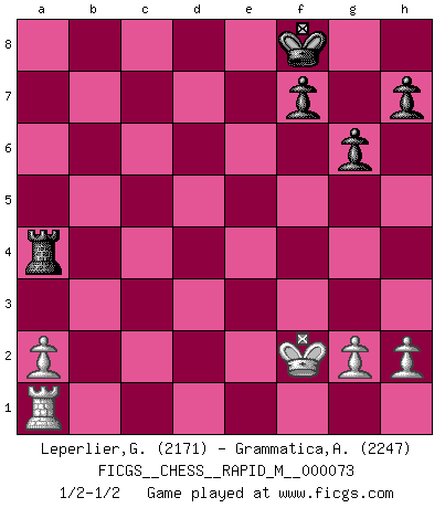 Last move : 1/2-1/2 2014 September 29 19:15:9 [Event "FICGS__CHESS__RAPID_M__000073"] [Site "FICGS"] [Date "2014.06.29"] [Round "1"] [White "Leperlier,Gabriel"] [Black "Grammatica,Andrea"] [Result "1/2-1/2"] [WhiteElo "2171"] [BlackElo "2247"] 1.d4 Nf6 2.c4 g6 3.Nc3 d5 4.cxd5 Nxd5 5.e4 Nxc3 6.bxc3 Bg7 7.Bc4 c5 8.Ne2 Nc6 9.Be3 O-O 10.O-O Qc7 11.Rc1 b6 12.f4 e6 13.dxc5 Na5 14.Bd3 Rd8 15.Qc2 Bf8 16.cxb6 axb6 17.Bd4 Ba6 18.Rcd1 Bxd3 19.Rxd3 Nc4 20.Ng3 e5 21.fxe5 Nxe5 22.R3d1 Bg7 23.Qb2 Rd6 24.Ne2 Qc4 25.Nc1 Re8 26.Nb3 Nc6 27.Bxb6 Bxc3 28.Qb1 Rxd1 29.Rxd1 Nb4 30.Bd4 Ra8 31.Bxc3 Qxc3 32.Nc1 Re8 33.Nd3 Rxe4 34.Nxb4 Rxb4 35.Qa1 Qxa1 36.Rxa1 Ra4 37.Kf2 Kf8 1/2-1/2 King's Indian defense, 3.Nc3 Kingside Castling by player Black (move 9) Kingside Castling by player White (move 10) 10 pieces endgame at move 36 : White KRPPP , Black KRPPP WHITE : King + 1 Rook 3 Pawns BLACK : King + 1 Rook 3 Pawns This chess game ended in a draw. Follow this game move after move (download)When in doubt... play Chess ! (Tevis) Fallen sollten polizeilich verboten werden. (Savielly Grigorievitsch Tartakower) Si pudieramos observar el interior de la cabeza de un jugador de Ajedrez, encontraríamos ahí un mundo lleno de sentimientos, imágenes, ideas, emoción y pasión. (Alfred Binet) On croit qu'il y a plus de mauvais joueurs que de bons joueurs, c'est faux : Il y a autant de joueurs qui gagnent que de joueurs qui perdent. (Philippe Geluck) The weakness of an artist is dogma. (Josh Waitzkin)