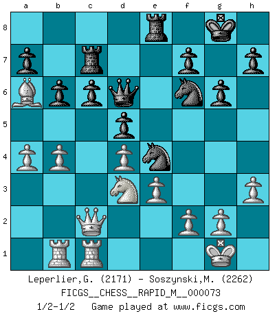 Last move : 1/2-1/2 2014 August 5 9:17:12 [Event "FICGS__CHESS__RAPID_M__000073"] [Site "FICGS"] [Date "2014.06.29"] [Round "1"] [White "Leperlier,Gabriel"] [Black "Soszynski,Marek"] [Result "1/2-1/2"] [WhiteElo "2171"] [BlackElo "2262"] 1.d4 Nc6 2.Nf3 d5 3.c4 Bg4 4.Nc3 e6 5.cxd5 exd5 6.Bf4 Bd6 7.Bxd6 Qxd6 8.e3 Nf6 9.Be2 O-O 10.O-O Ne7 11.Qb3 Rab8 12.h3 Bxf3 13.Bxf3 c6 14.Be2 Qd7 15.Qc2 Nc8 16.b4 Nd6 17.Bd3 g6 18.Rfc1 Rfc8 19.Na4 b6 20.Nb2 Qe7 21.Ba6 Rc7 22.a4 Nde4 23.Nd3 Qd6 24.Rab1 Re8 25.Bb5 Rec8 26.Ba6 Re8 1/2-1/2 Queen's pawn : Lundin (Kevitz-Mikenas) defense Kingside Castling by player Black (move 9) Kingside Castling by player White (move 10) This chess game ended in a draw. Follow this game move after move (download)The passed Pawn is a criminal, who should be kept under lock and key. Mild measures, such as police surveillance, are not sufficient. (Aaron Nimzovich) Rubinstein ist ein Turmendspiel, welches die Götter vor tausenden von Jahren begannen. (Savielly Grigorievitsch Tartakower) El estómago es una parte esencial del maestro de Ajedrez. (Bent Larsen) On a dit que l'homme se distingue de l'animal par le fait qu'il achète plus de livres qu'il ne peut en lire. Je voudrais suggérer qu'inclure à la liste des livres quelques livres d'échecs rendrait la distinction manifeste. (Edward Lasker) It's only after you lost everything, Tyler says, that you're free to do anything. (Chuck Palahniuk, Fight Club)