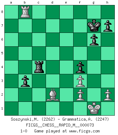 Last move : 1-0 2014 September 21 14:4:16 [Event "FICGS__CHESS__RAPID_M__000073"] [Site "FICGS"] [Date "2014.06.29"] [Round "1"] [White "Soszynski,Marek"] [Black "Grammatica,Andrea"] [Result "1-0"] [WhiteElo "2262"] [BlackElo "2247"] 1.Nf3 Nf6 2.c4 g6 3.d4 Bg7 4.Nc3 d5 5.Qb3 dxc4 6.Qxc4 O-O 7.e4 a6 8.Be2 b5 9.Qb3 c5 10.dxc5 Be6 11.Qc2 Nbd7 12.Be3 Rc8 13.Rd1 b4 14.Nd5 Bxd5 15.exd5 Nxc5 16.O-O Qd6 17.Rc1 Qb8 18.Rfd1 a5 19.Bc4 Nb7 20.Qe2 Nd6 21.Bf4 Qa8 22.b3 Rfe8 23.Nd4 Nfe4 24.Nc6 Nc3 25.Nxe7+ Rxe7 26.Qxe7 Nxc4 27.bxc4 Re8 28.Qh4 Ne2+ 29.Kf1 Nxc1 30.Bxc1 Qc8 31.Bg5 f6 32.Be3 f5 33.d6 Re4 34.Qg3 Qxc4+ 35.Kg1 f4 36.Qf3 Bf6 37.Bb6 a4 38.d7 Qe2 39.Be3 Qxf3 40.gxf3 Rc4 41.d8Q+ Bxd8 42.Rxd8+ Kg7 43.Bd2 b3 44.axb3 axb3 45.Rb8 1-0 Reti Opening Kingside Castling by player Black (move 6) Kingside Castling by player White (move 16) Promotion Queen by player White (move 41) Player White won this chess game. Follow this game move after move (download)Chess is a fighting game which is purely intellectual and includes chance. (Richard Reti) Alles was ich jemals tun will ist Schach spielen. (Robert James Fischer) Bobby es la celebridad menos entendida y malinterpretada que camina el la faz de esta tierra. (Yasser Seirawan) La solitude du joueur d'Echecs à l'approche du mat est semblable à celle du condamné. (Francis Szpiner) All men can see these tactics whereby I conquer, but what none can see is the strategy out of which victory is evolved. (Sun Tzu)