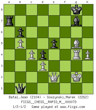 Last move : 1/2-1/2 2014 August 3 22:4:51 [Event "FICGS__CHESS__RAPID_M__000073"] [Site "FICGS"] [Date "2014.06.29"] [Round "1"] [White "Batal,Jean"] [Black "Soszynski,Marek"] [Result "1/2-1/2"] [WhiteElo "2104"] [BlackElo "2262"] 1.c4 Nc6 2.Nc3 e5 3.g3 g6 4.Bg2 Bg7 5.d3 d6 6.e4 h5 7.h4 Nd4 8.Nce2 c5 9.Nxd4 cxd4 10.b4 a5 11.Qa4+ Bd7 12.b5 Nh6 13.Nf3 O-O 14.O-O b6 15.Nh2 Rc8 16.f4 f5 17.fxe5 dxe5 18.Bg5 Qc7 19.Qd1 Qd6 20.Qe2 Rce8 21.Rae1 Be6 22.exf5 Nxf5 23.Qe4 Bf7 24.Qc6 Qb4 25.g4 Ng3 26.Be4 Re6 27.Qd7 Nxe4 28.Rxe4 R6e8 29.a3 Qxa3 30.Rxf7 Rxf7 31.Qxe8+ Rf8 32.Qe6+ Kh7 33.gxh5 gxh5 34.Qh3 Qa1+ 35.Nf1 a4 36.Qg2 Qb1 37.Qe2 Rf7 38.Kg2 a3 39.Nd2 a2 40.Qxh5+ Kg8 41.Nxb1 axb1Q 42.Qe2 Ra7 43.Rg4 1/2-1/2 English Opening Kingside Castling by player Black (move 13) Kingside Castling by player White (move 14) Promotion Queen by player Black (move 41) This chess game ended in a draw. Follow this game move after move (download)Kasparov : J'adoube , Ivanchuk : S'il vous plaît ! (Garry Kasparov & Vassily Ivanchuk, Linares 1997) Ich würde die 30 stärksten Spieler der USA im Simultanspiel besiegen. (José Raúl Capablanca) Combinaciones deslumbrantes son para la mayorÃa, mover madera es para los pocos. (Georg Kieninger) Ce qui est bien, c'est d'avoir tout un tas de pièces en prise : l'adversaire ne peut en prendre qu'une à la fois. Cité par Thierry Audin. But they are useless. They can only give you answers. (Pablo Picasso, about computers)