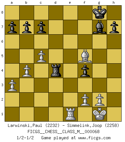 Last move : 1/2-1/2 2014 July 13 17:33:59 [Event "FICGS__CHESS__CLASS_M__000068"] [Site "FICGS"] [Date "2014.06.30"] [Round "1"] [White "Larwinski,Paul"] [Black "Simmelink,Joop"] [Result "1/2-1/2"] [WhiteElo "2232"] [BlackElo "2258"] 1.d4 Nf6 2.c4 g6 3.Nc3 Bg7 4.e4 d6 5.Nf3 O-O 6.Be2 e5 7.Be3 Ng4 8.Bg5 f6 9.Bh4 g5 10.Bg3 Nh6 11.dxe5 dxe5 12.O-O Nc6 13.h3 g4 14.hxg4 Bxg4 15.Re1 Qxd1 16.Raxd1 Rad8 17.Nd5 Rd7 18.b4 Ne7 19.Ne3 Rxd1 20.Rxd1 Bc8 21.c5 Be6 22.Bh4 Kf7 23.a3 Rc8 24.Ne1 Ng6 25.Bg3 f5 26.exf5 Nxf5 27.Nxf5 Bxf5 28.Bh5 Kg8 29.Nf3 Nf4 30.Bxf4 exf4 31.Nd4 Bg6 32.Bxg6 Rd8 33.Bf5 Rxd4 34.Re1 1/2-1/2 King's Indian : Gligoric-Taimanov system Kingside Castling by player Black (move 5) Kingside Castling by player White (move 12) This chess game ended in a draw. Follow this game move after move (download)The older I grow, the more I value pawns. (Paul Keres) Rauchen ist dem Schachspieler bei seiner Arbeit, also im Wettkampf, untersagt. (Viktor Kortschnoi) El Ajedrez es imaginación. (David Bronstein) Si rien de grave n'est détecté lors de l'analyse d'une position, on joue alors le coup. Seconde règle de Blumenfeld. There are two kinds of people in the world, my friend. Those who have a loaded gun and those who dig. You dig ! (Blondie in The Good, The Bad and The Ugly)