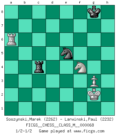 Last move : 1/2-1/2 2014 July 6 20:33:13 [Event "FICGS__CHESS__CLASS_M__000068"] [Site "FICGS"] [Date "2014.06.30"] [Round "1"] [White "Soszynski,Marek"] [Black "Larwinski,Paul"] [Result "1/2-1/2"] [WhiteElo "2262"] [BlackElo "2232"] 1.d4 d5 2.c4 dxc4 3.e4 e5 4.Nf3 exd4 5.Bxc4 Nc6 6.O-O Be6 7.Bb5 Bc5 8.b4 Bb6 9.a4 a6 10.Bxc6+ bxc6 11.a5 Ba7 12.Bb2 Nf6 13.Bxd4 Bxd4 14.Nxd4 Qd6 15.Nxe6 fxe6 16.Nd2 O-O 17.Nf3 Nxe4 18.Re1 Qxd1 19.Raxd1 Nc3 20.Rc1 Nd5 21.Rxc6 Nxb4 22.Rxc7 Rac8 23.Rxc8 Rxc8 24.h4 Rc5 25.Rb1 Rc4 26.g3 h6 27.Kf1 Kf8 28.Ne5 Re4 29.f4 g5 30.hxg5 hxg5 31.Nf3 gxf4 32.Ng5 Rc4 33.Nxe6+ Kg8 34.Nxf4 Nc6 35.Rb6 Nxa5 36.Rxa6 Nc6 37.Kg2 Ne5 1/2-1/2 QGA : 3.e4 Kingside Castling by player White (move 6) Kingside Castling by player Black (move 16) 10 pieces endgame at move 33 : White KRNPP , Black KRNPP WHITE : King + 1 Rook 1 Knight 2 Pawns BLACK : King + 1 Rook 1 Knight 2 Pawns 9 pieces endgame at move 34 : White KRNPP , Black KRNP WHITE : King + 1 Rook 1 Knight 2 Pawns BLACK : King + 1 Rook 1 Knight 1 Pawn 8 pieces endgame at move 35 : White KRNP , Black KRNP WHITE : King + 1 Rook 1 Knight 1 Pawn BLACK : King + 1 Rook 1 Knight 1 Pawn 7 pieces endgame at move 36 : White KRNP , Black KRN WHITE : King + 1 Rook 1 Knight 1 Pawn BLACK : King + 1 Rook 1 Knight This chess game ended in a draw. Follow this game move after move (download)Mistrust is the most necessary characteristic of the Chess player. (Siegbert Tarrasch) Modernes Schach sorgt sich zuviel um Dinge wie Bauernstruktur usw. Vergessen Sie das, Schachmatt beendet das Spiel! (Nigel Short) El Ajedrez es tan inspirador que yo no creo que un buen jugador sea capaz de tener un pensamiento malo durante una partida. (Wilhelm Steinitz) Le joueur d'Echecs qui veut atteindre le top est obligé de développer son propre credo créatif. Alexeï Stepanovicth Souétine. Il est facile d'écrire des livres ! Ce qui est difficile, c'est de jouer ! (Alexeï Stepanovicth Souétine) Be who you are, and say what you feel because those who mind don't matter, and those who matter don't mind. (Dr Seuss)