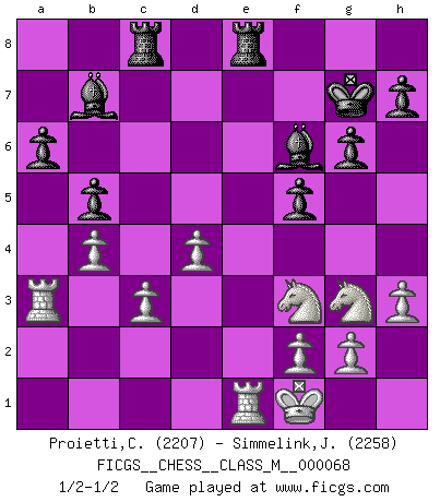 Last move : 1/2-1/2 2014 July 29 22:4:11 [Event "FICGS__CHESS__CLASS_M__000068"] [Site "FICGS"] [Date "2014.06.30"] [Round "1"] [White "Proietti,Costantino"] [Black "Simmelink,Joop"] [Result "1/2-1/2"] [WhiteElo "2207"] [BlackElo "2258"] 1.e4 e5 2.Nf3 Nc6 3.Bb5 a6 4.Ba4 Nf6 5.O-O Be7 6.Re1 b5 7.Bb3 O-O 8.h3 Bb7 9.d3 d5 10.exd5 Nxd5 11.Nxe5 Nd4 12.Bd2 c5 13.Nc3 Nxb3 14.axb3 Nb4 15.Ne4 f5 16.Ng3 Qd5 17.Nf3 Qd7 18.Bxb4 cxb4 19.d4 Rac8 20.Qd3 g6 21.c4 bxc3 22.bxc3 Bf6 23.b4 Qd6 24.Ra3 Kg7 25.Ne5 Qd5 26.Qf3 Qxf3 27.Nxf3 Rfe8 28.Kf1 1/2-1/2 Ruy Lopez : Closed, 7...O-O Kingside Castling by player White (move 5) Kingside Castling by player Black (move 7) This chess game ended in a draw. Follow this game move after move (download)Fischer sacrificed virtually everything most of us weakies (to use his term) value, respect, and cherish, for the sake of an artful, often beautiful board game, for the ambivalent privilege of being its greatest master. (Paul Kollar) Konzentriere dich auf materielle Gewinne. Nimm, was dir dein Gegner gibt, ausser es gibt einen guten Grund der dagegenspricht. (Robert James Fischer) Un mal plan es mejor que no tener ningún plan. (Frank Marshall) Les échecs sont utiles à l'exercice de la faculté de penser et à celle de l'imagination. Car nous devons posséder une méthode élaborée pour atteindre des buts partout où nous devons conduire notre raison. (Leibnitz) The faster the computer, the slower the brain. (Thibault de Vassal)