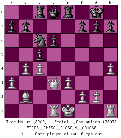 Last move : 0-1 2014 December 2 0:24:38 [Event "FICGS__CHESS__CLASS_M__000068"] [Site "FICGS"] [Date "2014.06.30"] [Round "1"] [White "Tkac,Matus"] [Black "Proietti,Costantino"] [Result "0-1"] [WhiteElo "2202"] [BlackElo "2207"] 1.Nf3 Nf6 2.c4 e6 3.Nc3 Bb4 4.Qc2 O-O 5.a3 Bxc3 6.Qxc3 d6 7.e3 e5 8.d4 exd4 9.Nxd4 c5 10.Nf3 Nc6 11.b3 Ne4 12.Qc2 Qa5+ 13.Nd2 Nd4 14.Qb2 Re8 15.b4 Qd8 16.Nxe4 Rxe4 17.Bd3 Re6 18.h4 Re8 19.Qc3 Bf5 20.Bb2 Bxd3 21.Qxd3 Nc6 22.Rd1 Rc8 0-1 This chess game has been lost on time (started : 2014.06.30 12:16:17) Reti Opening Kingside Castling by player Black (move 4) Player Black won this chess game. Follow this game move after move (download)Chess problems demand from the composer the same virtues that characterize all worthwhile art: originality, invention, conciseness, harmony, complexity, and splendid insincerity. (Vladimir Nabokov) Ich habe Putins Aufstieg an die Macht beobachtet und seine Politik, die demokratischen Institutionen meines Landes zu zerstören. (Garry Kasparov) El Ajedrez es un juego de pelea el cual es puramente intelectual e incluye la suerte. (Richard Reti) Votre seul travail dans les ouvertures est d'obtenir un milieu de partie jouable. (Lajos Portish) However beautiful the strategy, you should occasionally look at the results. (Winston Churchill)