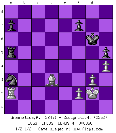 Last move : 1/2-1/2 2014 September 8 14:51:30 [Event "FICGS__CHESS__CLASS_M__000068"] [Site "FICGS"] [Date "2014.06.30"] [Round "1"] [White "Grammatica,Andrea"] [Black "Soszynski,Marek"] [Result "1/2-1/2"] [WhiteElo "2247"] [BlackElo "2262"] 1.d4 Nf6 2.c4 g6 3.g3 Bg7 4.Bg2 d5 5.cxd5 Nxd5 6.e4 Nb6 7.Ne2 c5 8.d5 O-O 9.O-O e6 10.Nbc3 exd5 11.exd5 Bf5 12.h3 h5 13.Ne4 Na6 14.N2c3 Qd7 15.h4 Rfe8 16.Bg5 Rac8 17.a3 Bxe4 18.Nxe4 Bxb2 19.Bf6 Bxa1 20.Bxa1 Rxe4 21.Bxe4 Nc7 22.Qc2 Nb5 23.Bxg6 Qxd5 24.Bh7+ Kf8 25.Qb1 Nd4 26.Be4 Qb3 27.Bxd4 Qxb1 28.Bxc5+ Rxc5 29.Rxb1 Ra5 30.Bxb7 Nc4 31.Bf3 Nxa3 32.Ra1 Kg7 33.Ra2 Kg6 34.Kg2 Kh6 35.Be4 Kg7 36.Bd3 Kh6 37.Be2 Kg6 38.Bd3+ 1/2-1/2 King's Indian : 3.g3, counterthrust variation Kingside Castling by player Black (move 8) Kingside Castling by player White (move 9) This chess game ended in a draw. Follow this game move after move (download)I won't play with you anymore. You have insulted my friend. - When an opponent cursed himself for a blunder. (Miguel Najdorf) Ein typischer, sehr verbreiteter Gedankenschädling ist der, daß der betreffende Amateur von der Annanhme ausgeht, daß jeder einzelne Zug etwas zu leisten habe. (Aaron Nimzowitsch) Cuando me preguntan: -¿Cual es el secreto que te hace hacer mejores movidas que tus oponentes?, Yo respondo: Me da gusto que me pregunten eso, porque, como veran, hay una simple razón. Yo pienso mis propias movidas y dejo a mi oponente que el piense las suyas. (Alexander Alekhine) La solitude du joueur d'Echecs à l'approche du mat est semblable à celle du condamné. (Francis Szpiner) Now the reason the enlightened prince and the wise general conquer the enemy whenever they move and their achievements surpass those of ordinary men is foreknowledge. (Sun Tzu)