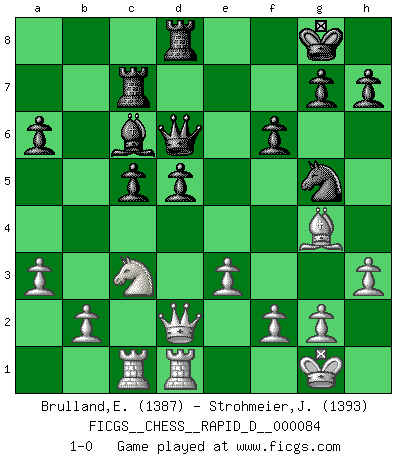 Last move : 1-0 2014 October 3 2:7:28 [Event "FICGS__CHESS__RAPID_D__000084"] [Site "FICGS"] [Date "2014.07.01"] [Round "1"] [White "Brulland,Emmanuel"] [Black "Strohmeier,Josef"] [Result "1-0"] [WhiteElo "1387"] [BlackElo "1393"] 1.c4 Nf6 2.d4 e6 3.a3 b6 4.Nc3 Bb7 5.Bg5 Be7 6.Nf3 O-O 7.Bf4 d5 8.e3 Nbd7 9.Nb5 Ne8 10.Ne5 a6 11.Nc3 Nxe5 12.Bxe5 f6 13.Bg3 Rc8 14.cxd5 exd5 15.Be2 c5 16.O-O Bd6 17.Bxd6 Qxd6 18.Re1 Nc7 19.dxc5 bxc5 20.Rc1 Rfd8 21.Qd2 Ne6 22.Bf3 Bc6 23.Red1 Ng5 24.Bg4 Rc7 25.h3 1-0 English, 1...Nf6 (Anglo-Indian defense) Kingside Castling by player Black (move 6) Kingside Castling by player White (move 16) Player White won this chess game. Follow this game move after move (download)I give 98 percent of my mental energy to Chess. Others give only 2 percent. (Bobby Fischer) Schach ist wie eine schöne Frau, zu der wir ständig zurückkehren, gleichviel, wie oft sie uns zurückweist. (Anonymous) El arma más poderosa en el Ajedrez, es tener la próxima movida. (David Bronstein) Mais n'est-ce pas déjà le limiter injurieusement que d'appeler les échecs un jeu? N'est-ce pas aussi une science, un art, ou quelque chose qui, comme le cercueil de Mahomet entre ciel et terre, est suspendu entre l'un et l'autre, et qui réunit un nombre incroyable de contraires ? (Stefan Zweig) To err is human, but to really foul things up requires a computer. (Farmer's Almanac, 1978)