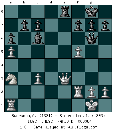 Last move : 1-0 2014 August 25 12:11:9 [Event "FICGS__CHESS__RAPID_D__000084"] [Site "FICGS"] [Date "2014.07.01"] [Round "1"] [White "Barradas,Anderson"] [Black "Strohmeier,Josef"] [Result "1-0"] [WhiteElo "1331"] [BlackElo "1393"] 1.e4 e5 2.Nf3 Nc6 3.Bb5 a6 4.Bxc6 dxc6 5.d4 exd4 6.Nxd4 Bc5 7.Be3 Qf6 8.c3 Ne7 9.b4 Bb6 10.O-O O-O 11.a4 Rd8 12.a5 Ba7 13.Na3 c5 14.bxc5 Bxc5 15.Qa4 Bd7 16.Qc4 Bd6 17.f4 Nc6 18.Nxc6 Bxc6 19.e5 Qg6 20.exd6 Rxd6 21.Qe2 Re8 22.Rf2 Rde6 23.f5 Rxe3 24.Qxe3 1-0 Ruy Lopez : Exchange variation Kingside Castling by player White (move 10) Kingside Castling by player Black (move 10) Player White won this chess game. Follow this game move after move (download)Only the player with the initiative has the right to attack. (Wilhelm Steinitz) Es ist im Leben wie im Schachspiel. Wir entwerfen einen Plan, dieser bleibt jedoch bedingt durch das, was im Schachspiel dem Gegner, im Leben dem Schicksal zu tun belieben wird. (Arthur Schopenhauer) No es suficiente ser un buen jugador, se debe también de jugar bién. (Siegbert Tarrasch) Ne tendez aucun piège pour le plaisir ! Ne jouez rien dans l'espoir que l'adversaire réagisse de façon stupide ! Prenez toujours pour acquis que l'adversaire va trouver le meilleur coup ! Ne jouez jamais de coup dans l'espoir que l'adversaire ne voie pas la menace ! Chacun de vos coups doit améliorer la position d'une façon ou d'une autre. Beta. Software undergoes beta testing shortly before it's released. Beta is latin for still doesn't work. (Anonymous)