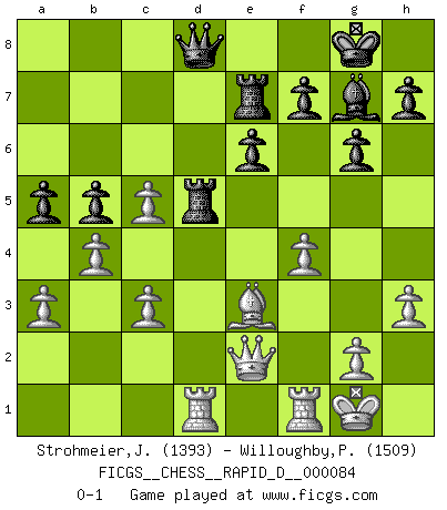 Last move : 0-1 2014 October 7 21:25:0 [Event "FICGS__CHESS__RAPID_D__000084"] [Site "FICGS"] [Date "2014.07.01"] [Round "1"] [White "Strohmeier,Josef"] [Black "Willoughby,Peter"] [Result "0-1"] [WhiteElo "1393"] [BlackElo "1509"] 1.e4 g6 2.d4 Bg7 3.Nc3 Nc6 4.Be3 d6 5.f4 Nf6 6.Nf3 Bg4 7.Be2 O-O 8.O-O a6 9.h3 Bxf3 10.Bxf3 d5 11.exd5 Nb4 12.Qd2 Nbxd5 13.Nxd5 Nxd5 14.Bf2 Rb8 15.c3 c6 16.Be4 e6 17.Rad1 b5 18.a3 a5 19.Bg3 Rb6 20.Rc1 Nf6 21.Bf3 c5 22.Bf2 Rd6 23.Qe2 Nd5 24.Bxd5 Rxd5 25.dxc5 Bh6 26.Be3 Re8 27.Rcd1 Re7 28.b4 Bg7 0-1 This chess game has been lost on time (started : 2014.07.01 13:19:55) Robatsch defense Kingside Castling by player Black (move 7) Kingside Castling by player White (move 8) Player Black won this chess game. Follow this game move after move (download)Every Pawn is a potential Queen. (James Mason) Die westlichen Werte sind eine Sprache, welche die Putin-Administration nicht versteht. (Garry Kasparov) Sin errores no puede haber brillantez. (Emanuel Lasker) C'est la seule position que je connaisse où les deux camps sont mals. Propos prêtés à V. Anand. Coffee just isn't my cup of tea. (Unknown)