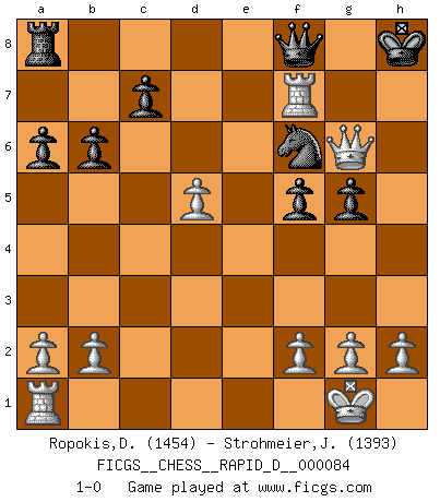 Last move : 1-0 2014 August 31 0:45:49 [Event "FICGS__CHESS__RAPID_D__000084"] [Site "FICGS"] [Date "2014.07.01"] [Round "1"] [White "Ropokis,Dimitrios"] [Black "Strohmeier,Josef"] [Result "1-0"] [WhiteElo "1454"] [BlackElo "1393"] 1.d4 d5 2.c4 e6 3.Nc3 Nf6 4.Nf3 Be7 5.e3 O-O 6.Bd3 dxc4 7.Bxc4 a6 8.O-O b6 9.e4 Bb7 10.d5 exd5 11.Bxd5 Bxd5 12.exd5 Nbd7 13.Bg5 h6 14.Nd4 hxg5 15.Nc6 Qe8 16.Re1 Kh7 17.Rxe7 Qc8 18.Ne4 Nxe4 19.Qh5+ Kg8 20.Rxe4 Re8 21.Ne7+ Rxe7 22.Rxe7 g6 23.Qf3 f5 24.Qh3 Nf6 25.Qh6 Qf8 26.Qxg6+ Kh8 27.Rf7 1-0 QGD : 4.Nf3 Kingside Castling by player Black (move 5) Kingside Castling by player White (move 8) Player White won this chess game. Follow this game move after move (download)A man without frontiers. He didn't divide the East and the West, he brought them together in their admiration for him. (Ljubomir Ljubojevic, about Bobby Fischer's death) Ich organisiere ein großes Turnier, was mich etwa 120000 Dollar kostet. Ich denke, das ist das erste Mal in der Schachgeschichte, daß ein Schachgroßmeister auch als Mäzen auftritt. (Miguel Najdorf) Si tu oponente te ofrece un empate, trata de averiguar porque piensa él que esta en una posición peor. (Nigel Short) Les échecs, c'est l'art d'analyser. (Mikhail Botvinnik) The difference between stupidity and genius is that genius has its limits. (Murphy)