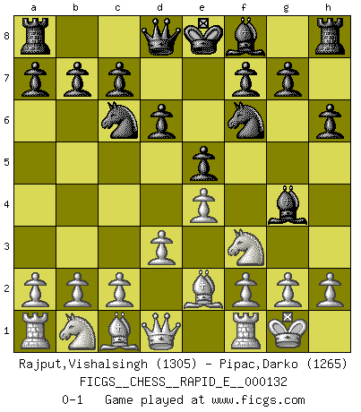 Last move : 0-1 2014 August 10 4:14:11 [Event "FICGS__CHESS__RAPID_E__000132"] [Site "FICGS"] [Date "2014.07.01"] [Round "1"] [White "Rajput,Vishalsingh"] [Black "Pipac,Darko"] [Result "0-1"] [WhiteElo "1305"] [BlackElo "1265"] 1.e4 e5 2.Nf3 Nc6 3.Bc4 d6 4.O-O Bg4 5.Be2 Nf6 6.d3 h6 0-1 This chess game has been lost on time (started : 2014.07.01 15:5:36) King's pawn game Kingside Castling by player White (move 4) Player Black won this chess game. Follow this game move after move (download)When in doubt... play Chess ! (Tevis) Jeder weiß, dass Gasprom Putins persönliches Machtinstrument ist. Die Firma wird vom Kreml aus geleitet und wird schon deshalb nie transparent sein. (Garry Kasparov) Los finales de Peón son del Ajedrez lo que el cesped es del Golf. (Cecil Purdy) Le jeu d'échecs fait naître et fortifie en nous plusieurs qualités précieuses dans le cours de l'existence, telles que la prévoyance, la circonspection, la prudence, et la persévérance. (Benjamin Franklin - 1783, la morale des échecs) Only sick music makes money today. (Friedrich Nietzsche)