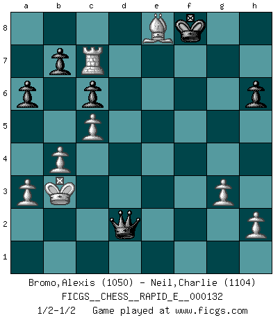 Last move : 1/2-1/2 2014 August 14 20:39:22 [Event "FICGS__CHESS__RAPID_E__000132"] [Site "FICGS"] [Date "2014.07.01"] [Round "1"] [White "Bromo,Alexis"] [Black "Neil,Charlie"] [Result "1/2-1/2"] [WhiteElo "1050"] [BlackElo "1104"] 1.d4 d5 2.c4 e6 3.Nc3 Nf6 4.a3 c6 5.c5 Be7 6.Nf3 Nbd7 7.b4 a6 8.Bg5 h6 9.Bxf6 Bxf6 10.e3 O-O 11.Bd3 e5 12.dxe5 Nxe5 13.Nxe5 Bxe5 14.Qc2 Qh4 15.O-O-O Be6 16.g3 Qf6 17.Kb2 Rad8 18.f4 Bc7 19.Rdf1 Kh8 20.e4 dxe4 21.Bxe4 Bc4 22.Rf2 Rfe8 23.Re1 g6 24.Rd2 Kh7 25.Rxd8 Rxd8 26.f5 Bd5 27.fxg6+ fxg6 28.Bxg6+ Kg7 29.Kb1 Bg2 30.Bh5 Bh3 31.Ne4 Qe6 32.Nd6 Qf6 33.Ne8+ Rxe8 34.Bxe8 Bf5 35.Qxf5 Qxf5+ 36.Kc1 Qd3 37.Re7+ Kf8 38.Rxc7 Qe3+ 39.Kb2 Qe2+ 40.Kb3 Qd1+ 41.Kb2 Qd2+ 42.Kb3 1/2-1/2 QGD : 3...Nf6 Kingside Castling by player Black (move 10) Queenside Castling by player White (move 15) This chess game ended in a draw. Follow this game move after move (download)Bobby Fischer's current state of mind is indeed a tragedy. One of the world's greatest Chess players - the pride and sorrow of American Chess. (Frank Brady) Strategie ist, wie man ein Mädchen auf den Rücksitz bekommt. Taktik ist, was man tut, wenn man dann dort ist. (Anonymous) Una buena memoria, concentración, imaginación y una fuerte voluntad, se requiere para llegar a ser un buen jugador. (Bobby Fischer) RxDa4 pat (...) Good decisions come from experience, and experience comes from bad decisions. (Anonymous)
