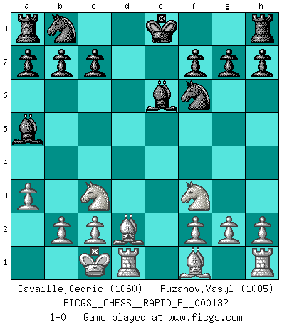 Last move : 1-0 2014 September 1 0:14:56 [Event "FICGS__CHESS__RAPID_E__000132"] [Site "FICGS"] [Date "2014.07.01"] [Round "1"] [White "Cavaille,Cedric"] [Black "Puzanov,Vasyl"] [Result "1-0"] [WhiteElo "1060"] [BlackElo "1005"] 1.e4 e5 2.Nf3 d5 3.exd5 e4 4.Ng1 Qxd5 5.d3 exd3 6.Qxd3 Be6 7.Qxd5 Bxd5 8.Nc3 Be6 9.Nf3 Bb4 10.Bd2 Nf6 11.a3 Ba5 12.O-O-O 1-0 QP counter-gambit (elephant gambit) Queenside Castling by player White (move 12) Player White won this chess game. Follow this game move after move (download)The mistakes are there, waiting to be made. (Savielly Tartakower) Frage des Reporters: -Worin besteht das Ziel von Gambiteröffnungen? Antwort: -Auf Kosten der Partie einen Ruf als Angriffspieler zu erwerben.- (Siegbert Tarrasch) Los errores estan ahí, esperando a que se cometan. (Savielly Tartakower) Pour se monter efficace, un Cavalier a besoin d'avant-postes ! Les Cavaliers font les meilleurs bloqueurs de pions passés. True nature is revealed in times of difficulty. (Chinese proverb)