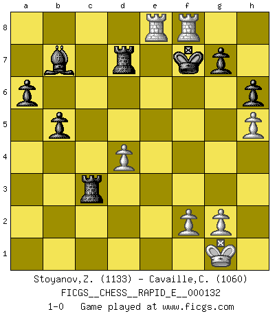 Last move : 1-0 2014 July 20 21:35:33 [Event "FICGS__CHESS__RAPID_E__000132"] [Site "FICGS"] [Date "2014.07.01"] [Round "1"] [White "Stoyanov,Zdravko"] [Black "Cavaille,Cedric"] [Result "1-0"] [WhiteElo "1133"] [BlackElo "1060"] 1.e4 e5 2.Nf3 d6 3.h3 Nc6 4.Bb5 Bd7 5.d3 a6 6.Bxc6 Bxc6 7.a3 Be7 8.Bd2 Nf6 9.Nc3 O-O 10.O-O b5 11.Re1 Bb7 12.Be3 d5 13.exd5 Nxd5 14.Nxe5 Nxc3 15.bxc3 Bf6 16.d4 Bxe5 17.dxe5 Qxd1 18.Raxd1 Rad8 19.Bd4 Rd5 20.Re3 c5 21.e6 cxd4 22.cxd4 fxe6 23.Rxe6 Rfd8 24.c3 R5d6 25.Re7 R8d7 26.Re8+ Kf7 27.Rde1 Rc7 28.R1e3 R6d7 29.Rh8 h6 30.R3e8 Rxc3 31.h4 Rxa3 32.h5 Rc3 33.Rhf8+ 1-0 Philidor's defense Kingside Castling by player Black (move 9) Kingside Castling by player White (move 10) Player White won this chess game. Follow this game move after move (download)If Chess is a science, it's a most inexact one. If Chess is an art, it is too exacting to be seen as one. If Chess is a sport, it's too esoteric. If Chess is a game, it's too demanding to be just a game. If Chess is a mistress, she's a demanding one. If Chess is a passion, it's a rewarding one. If Chess is life, it's a sad one. (Unknown) Du musst Deinen Gegner in einen tiefen dunklen Wald führen wo 2+2=5 ist und wo der Weg, der wieder hinausführt, nur breit genug für einen ist. (Mikhail Nekhemyevich Tal) El Ajedrez es como la guerra en un tablero. (Bobby Fischer) Avant la finale, les dieux ont créé le milieu de partie. (Tarrasch) In my experience, there's no such thing as luck. (Obi-Wan Kenobi in Star Wars ep.4)