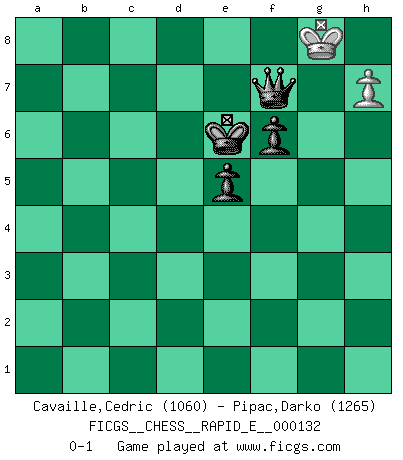 Last move : 0-1 2014 August 24 20:37:8 [Event "FICGS__CHESS__RAPID_E__000132"] [Site "FICGS"] [Date "2014.07.01"] [Round "1"] [White "Cavaille,Cedric"] [Black "Pipac,Darko"] [Result "0-1"] [WhiteElo "1060"] [BlackElo "1265"] 1.e4 e5 2.Nf3 Nc6 3.Bb5 d6 4.Bxc6+ bxc6 5.d4 Bg4 6.dxe5 Bxf3 7.Qxf3 dxe5 8.O-O Nf6 9.Nd2 h6 10.Qd3 Bb4 11.Qxd8+ Rxd8 12.Rd1 Bxd2 13.Rxd2 Rxd2 14.Bxd2 Nxe4 15.Be3 a6 16.c4 O-O 17.Rd1 f6 18.c5 Rb8 19.f3 Ng5 20.Bxg5 hxg5 21.Rb1 Rb5 22.b4 Kf7 23.a3 Ke6 24.Rd1 Rb8 25.Rd6+ cxd6 26.cxd6 Kxd6 27.Kf2 Rxb4 28.axb4 c5 29.bxc5+ Kxc5 30.Ke3 a5 31.Ke4 a4 32.Kf5 Kd6 33.Kg6 Ke6 34.Kxg7 a3 35.g3 a2 36.h4 gxh4 37.gxh4 a1Q 38.h5 Qf1 39.h6 Qg2+ 40.Kf8 Qxf3 41.h7 Qh5 42.Kg8 Qf7+ 0-1 Ruy Lopez : Old Steinitz defense Kingside Castling by player White (move 8) Kingside Castling by player Black (move 16) 10 pieces endgame at move 29 : White KPPP , Black KPPPPP WHITE : King + 3 Pawns BLACK : King + 5 Pawns 9 pieces endgame at move 34 : White KPPP , Black KPPPP WHITE : King + 3 Pawns BLACK : King + 4 Pawns 8 pieces endgame at move 36 : White KPP , Black KPPPP WHITE : King + 2 Pawns BLACK : King + 4 Pawns 7 pieces endgame at move 37 : White KPP , Black KPPP WHITE : King + 2 Pawns BLACK : King + 3 Pawns Promotion Queen by player Black (move 37) 6 pieces endgame at move 40 : White KP , Black KQPP WHITE : King + 1 Pawn BLACK : King + 1 Queen 2 Pawns Player Black won this chess game. Follow this game move after move (download)A thorough understanding of the typical mating continuations makes the most complicated sacrificial combinations leading up to them not only not difficult, but almost a matter of course. (Siegbert Tarrasch) Der Knackpunkt bei der Konzentration ist, daß wir nur durch sie etwas Neues und Ungewöhnliches am Schachbrett finden können. Sie ist der einzige Weg durch neue neue Ideen eine Überraschung zu bereiten. (Garry Kasparov) El Ajedrez moderno está demasiado preocupado con cosas como la estructura de Peones. Olvidenlo, el Jaque Mate termina la partida. (Nigel Short) Seul un grand joueur sait à quel point il joue faiblement. (Xavier Tartacover) I just play for fun. (Anna Kournikova)