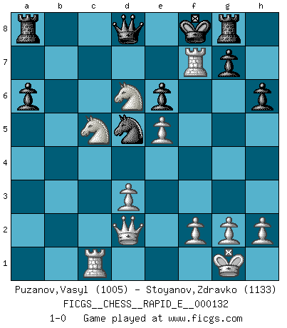 Last move : 1-0 2014 September 11 10:47:38 [Event "FICGS__CHESS__RAPID_E__000132"] [Site "FICGS"] [Date "2014.07.01"] [Round "1"] [White "Puzanov,Vasyl"] [Black "Stoyanov,Zdravko"] [Result "1-0"] [WhiteElo "1005"] [BlackElo "1133"] 1.e4 c5 2.b4 cxb4 3.a3 bxa3 4.Bxa3 e6 5.Bxf8 Kxf8 6.Nc3 Nc6 7.Nf3 a6 8.d4 b5 9.Bd3 d6 10.O-O Nb4 11.Nxb5 Nf6 12.Qd2 Nxd3 13.cxd3 Qb6 14.Rfb1 Bb7 15.Nc3 Qc6 16.Rc1 Qd7 17.e5 dxe5 18.dxe5 Nd5 19.Ne4 Ke7 20.Nc5 Qb5 21.Rab1 Qe8 22.Rxb7+ Kf8 23.Ng5 h6 24.Nxf7 Rg8 25.Nd6 Qd8 26.Rf7+ 1-0 Sicilian : wing gambit, Carlsbad variation Kingside Castling by player White (move 10) Player White won this chess game. Follow this game move after move (download)The Pawns are the soul of the game. (Francois Andre Danican Philidor) Im Leben werden Partien nie so unstrittig gewonnen wie im Spiel (Emanuel Lasker) No es tiempo de jugar al Ajedrez cuando la casa esta en llamas. (Proverbio Italiano) Le système Elo représente seulement une moyenne. Il est simplement un indicateur de votre stabilité. (Anatoli Karpov) The good fighters of old first put themselves beyond the possibility of defeat, and then waited for an opportunity of defeating the enemy. (Sun Tzu)