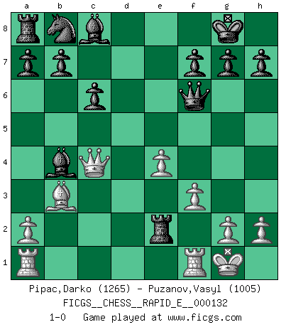 Last move : 1-0 2014 August 20 17:33:0 [Event "FICGS__CHESS__RAPID_E__000132"] [Site "FICGS"] [Date "2014.07.01"] [Round "1"] [White "Pipac,Darko"] [Black "Puzanov,Vasyl"] [Result "1-0"] [WhiteElo "1265"] [BlackElo "1005"] 1.e4 e5 2.d4 exd4 3.c3 dxc3 4.Bc4 cxb2 5.Bxb2 Bb4+ 6.Nd2 Nf6 7.f3 d5 8.Bxd5 c6 9.Bxf6 Qxf6 10.Bb3 O-O 11.Ne2 Rd8 12.O-O Rxd2 13.Qc1 Rxe2 14.Qc4 1-0 Danish gambit Kingside Castling by player Black (move 10) Kingside Castling by player White (move 12) Player White won this chess game. Follow this game move after move (download)Any material change in a position must come about by mate, a capture, or a Pawn promotion. (Purdy) Die jungen Leute sollen verstehen, dass sie noch etwas von mir lernen können und müssen. (Viktor Kortschnoi) Estaba muy claro de que el punto vulnerable del Gran Maestro Americano (Bobby Fischer) radicaba en las posiciones de doble filo, colgantes, irracionales, donde el siempre falló en encontrar un triunfo aún en una posición de clara victoria. (Efim Geller) Le temps de noter son nom sur la feuille de partie, j'étais déjà en zeitnot ! D'un modeste amateur apparié lors de la première ronde d'un open contre le grand-maître Azmaïparashvili. Humor is by far the most significant activity of the human brain. (Edward De Bono)