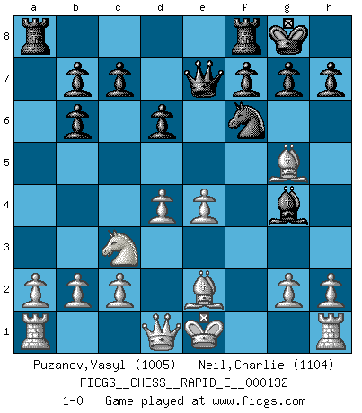 Last move : 1-0 2014 August 19 21:48:46 [Event "FICGS__CHESS__RAPID_E__000132"] [Site "FICGS"] [Date "2014.07.01"] [Round "1"] [White "Puzanov,Vasyl"] [Black "Neil,Charlie"] [Result "1-0"] [WhiteElo "1005"] [BlackElo "1104"] 1.e4 e5 2.f4 Bc5 3.Nf3 Nc6 4.fxe5 Nxe5 5.Nxe5 Qe7 6.d4 Bb6 7.Nc3 Nf6 8.Bg5 d6 9.Nc4 O-O 10.Nxb6 axb6 11.Bd3 Bg4 12.Be2 1-0 KGD : Classical variation Kingside Castling by player Black (move 9) Player White won this chess game. Follow this game move after move (download)A bad plan is better than none at all. (Frank Marshall) Wie bekannt hörte Morphy 1859 auf, Schach zu spielen. Seine Enttäuschung galt nicht so sehr dem Schach, wie den Schachspielern. (Robert James Fischer) Aquel que teme a un Peón de Reina aislado, debería de retirarse del Ajedrez. (Siegbert Tarrasch) 'L'échange des dames est un coup dur pour les deux adversaires...' Un journaliste lors d'une partie du match Spassky-Fischer Just because you do not take an interest in politics doesn't mean politics won't take an interest in you. (Pericles 430 B.C.)