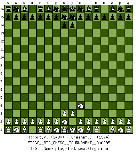 Last move : 1-0 2014 August 4 15:21:4 [Event "FICGS__BIG_CHESS__TOURNAMENT__000095"] [Site "FICGS"] [Date "2014.07.03"] [Round "1"] [White "Rajput,Vishalsingh"] [Black "Gresham,Jonathan"] [Result "1-0"] [WhiteElo "1490"] [BlackElo "1374"] 1.j2-k4 1-0 This big chess game has been lost on time (started : 2014.07.03 22:7:25) Follow this game move after move (download)The older I grow, the more I value pawns. (Paul Keres) Wenn ich mich einlogge, glauben die Leute gewöhnlich nicht, dass ich es selbst bin und sie fangen an, mir dumme Fragen zu stellen. Und wenn sie es glauben, stellen sie wieder andere dumme Fragen. (Judith Polgar) Creo que una cierta cantidad de temperamento es esperada de los genios del Ajedrez. (Ron Gross) Karpov est une pièce de musée. (Garry Kasparov) I feel so... helpless. (C-3PO in Star Wars ep.3)