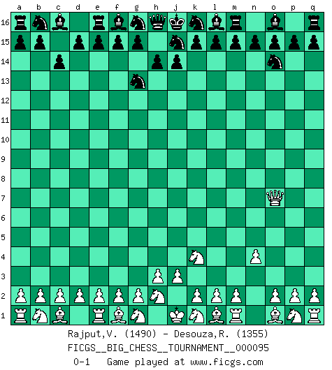 Last move : 0-1 2014 August 16 5:11:17 [Event "FICGS__BIG_CHESS__TOURNAMENT__000095"] [Site "FICGS"] [Date "2014.07.03"] [Round "1"] [White "Rajput,Vishalsingh"] [Black "Desouza,Romeo"] [Result "0-1"] [WhiteElo "1490"] [BlackElo "1355"] 1.j2-k4 h15-g13 2.h1-o7 p16-o14 3.n2-n4 c15-c14 0-1 This big chess game has been lost on time (started : 2014.07.03 22:7:25) Follow this game move after move (download)Pawns are born free, yet they are everywhere in chains. (Rick Kennedy) Kasparov ist eine Art Monster mit hundert Augen, denen auch nicht das Geringste entgeht. (Tony Miles) Una de estas pequeñas movidas modestas pudieran ser mas molestas a tu oponente que la amenaza mas grande. (Siegbert Tarrasch) Aucun coup ne doit être joué sans but. (Pedro Damiano) The beginning of wisdom is silence. The second step is listening. (Unknown)
