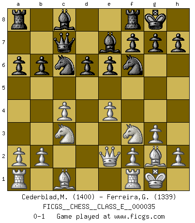 Last move : 0-1 2007 May 8 2:7:25 [Event "FICGS__CHESS__CLASS_E__000035"] [Site "FICGS"] [Date "2007.02.18"] [Round "1"] [White "Cederblad,Mikael"] [Black "Ferreira,Getulio"] [Result "0-1"] [WhiteElo "1400"] [BlackElo "1339"] 1.e4 c5 2.Nf3 d6 3.d4 cxd4 4.Qxd4 a6 5.c4 Nc6 6.Qd1 Nf6 7.Nc3 e6 8.g3 Be7 9.Bg2 Qc7 10.O-O O-O 11.Qe2 b6 0-1 Sicilian, Chekhover variation Kingside Castling by player White (move 10) Kingside Castling by player Black (move 10) Player Black won this chess game. Follow this game move after move (download)Morphy was probably the greatest genius of them all. (Bobby Fischer) Wie gewinnt Tal? Er entwickelt alle seine Figuren in die Brettmitte und opfert sie dann irgendwo. (Robert James Fischer) Siempre es mejor sacrificar los hombres de tu oponente. (Savielly Tartakower) On croit qu'il y a plus de mauvais joueurs que de bons joueurs, c'est faux : Il y a autant de joueurs qui gagnent que de joueurs qui perdent. (Philippe Geluck) Now the reason the enlightened prince and the wise general conquer the enemy whenever they move and their achievements surpass those of ordinary men is foreknowledge. (Sun Tzu)