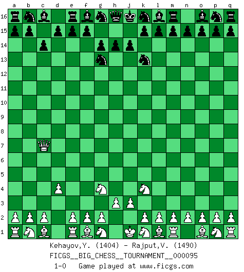 Last move : 1-0 2014 August 9 4:9:27 [Event "FICGS__BIG_CHESS__TOURNAMENT__000095"] [Site "FICGS"] [Date "2014.07.03"] [Round "1"] [White "Kehayov,Yulian"] [Black "Rajput,Vishalsingh"] [Result "1-0"] [WhiteElo "1404"] [BlackElo "1490"] 1.h2-g4 j15-k13 2.j2-k4 h15-g13 3.h1-o7 g15-g14 4.o7-c7 c15-c14 5.d2-d4 1-0 This big chess game has been lost on time (started : 2014.07.03 22:7:25) Follow this game move after move (download)It began to feel as though you were playing against Chess itself. - On playing against Robert Fischer. (Walter Shipman) Das Zentrum ist der Balkan des Schachbretts - Kriegshandlungen können in jedem Moment ausbrechen. (Aaron Nimzowitsch) Si el Ajedrez es una ciencia, es la mas inexacta. Si el Ajedrez es un arte, es demasiado inexacto para ser visto como tal. Si el Ajedrez es un deporte, es demasiado esotérico. Si el Ajedrez es un juego, es demasiado exigente para ser solo un juego. Si el Ajedrez es una aventura, es una muy demandante. Si el Ajedrez es una pasión, es una muy gratificante. Si el Ajedrez es la vida, es una muy triste. (Anónimo) Que feriez-vous si vous étiez en train de jouer aux échecs et que la fin du monde arrive ? Je continuerais à jouer. (Saint Borromée) To steal ideas from one person is plagiarism. To steal from many is research. (Unknown)