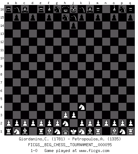 Last move : 1-0 2014 July 6 11:49:36 [Event "FICGS__BIG_CHESS__TOURNAMENT__000095"] [Site "FICGS"] [Date "2014.07.03"] [Round "1"] [White "Giordanino,Claudio"] [Black "Petropoulos,Athanasios"] [Result "1-0"] [WhiteElo "1781"] [BlackElo "1335"] 1.j2-k4 1-0 Follow this game move after move (download)It began to feel as though you were playing against Chess itself. - On playing against Robert Fischer. (Walter Shipman) Um sich vor der Gefahr einer Erkältung zu schützen, sorge der wanderlustige König beizeiten für ein brauchbares Versteck. (Aaron Nimzowitsch) Yo he agregado estos principios a la ley: pongan los Caballos en acción antes de que los dos Alfiles sean desarrollados. (Emanuel Lasker) Un footballeur joue avec ses pieds, parfois avec sa tête. Un joueur d'échecs ne joue qu'avec sa tête. Et quand il ne joue plus, il meurt. (Jacob Murray) If everyone is thinking alike, then somebody isn't thinking. (US General George S. Patton)
