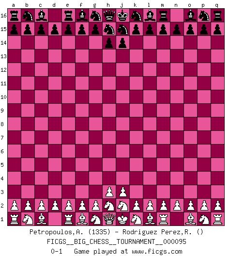 Last move : 0-1 2014 July 6 11:49:48 [Event "FICGS__BIG_CHESS__TOURNAMENT__000095"] [Site "FICGS"] [Date "2014.07.03"] [Round "1"] [White "Petropoulos,Athanasios"] [Black "Rodriguez Perez,Rene"] [Result "0-1"] [WhiteElo "1335"] [BlackElo ""] 0-1 Follow this game move after move (download)The most important feature of the Chess position is the activity of the pieces. This is absolutely fundamental in all phases of the game: Opening, Middlegame and especially Endgame. The primary constraint on a piece's activity is the Pawn structure. (Michael Stean) Wie kann ich Remis annehmen? Ich weiß ja gar nicht, wie ich stehe! (Fritz Sämisch) Nada excita más a Grandes Maestros aburridos que una novedad teórica. (Dominic Lawson) Il vaut toujours mieux jouer un plan faux de façon logique que de n'avoir pas de plan du tout. (Victor Kortchnoï) There is a computer disease that anybody who works with computers knows about. It's a very serious disease and it interferes completely with the work. The trouble with computers is that you 'play' with them ! (Richard P. Feynman)