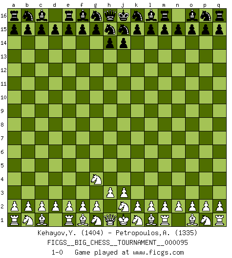 Last move : 1-0 2014 July 6 11:50:24 [Event "FICGS__BIG_CHESS__TOURNAMENT__000095"] [Site "FICGS"] [Date "2014.07.03"] [Round "1"] [White "Kehayov,Yulian"] [Black "Petropoulos,Athanasios"] [Result "1-0"] [WhiteElo "1404"] [BlackElo "1335"] 1.h2-g4 1-0 Follow this game move after move (download)Chess is a more highly symbolic game, but the aggressions are therefore even more frankly represented in the play. It probably began as a war game; that is, the representation of a miniature battle between the forces of two kingdoms. (Karl Meninger) Vielleicht wirkt die Aura früherer Spieler glanzvoller als die der heutigen Spieler, aber das liegt daran, dass man kein Programm wie Fritz hatte, das einem all die Löcher in ihren Partien zeigt. (Vladimir Kramnik) Solo existe una cosa que Fischer hace en el Ajedrez sin placer: ¡perder!. (Boris Spassky) Je fais ceci parce que dans cinquante coups j'obtiendrai cela; je m'appelle Mikhail Moisevitch Botvinnik. (Botvinnik) Programming can only do so much before it becomes too much. (Don Groves)