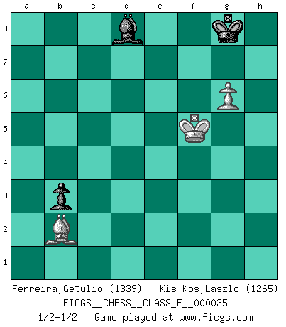 Last move : 1/2-1/2 2007 July 29 17:1:34 [Event "FICGS__CHESS__CLASS_E__000035"] [Site "FICGS"] [Date "2007.02.18"] [Round "1"] [White "Ferreira,Getulio"] [Black "Kis-Kos,Laszlo"] [Result "1/2-1/2"] [WhiteElo "1339"] [BlackElo "1265"] 1.c4 Nf6 2.Nc3 g6 3.Nf3 Bg7 4.g3 O-O 5.Bg2 d5 6.cxd5 Nxd5 7.O-O Nc6 8.d4 Nxc3 9.bxc3 e5 10.d5 e4 11.dxc6 exf3 12.Bxf3 b6 13.Bb2 Qxd1 14.Raxd1 Be6 15.a3 Rfd8 16.e3 Bb3 17.Rd7 Rxd7 18.cxd7 Rd8 19.Bc6 Be6 20.Rd1 Be5 21.Rd2 Bd6 22.e4 Kf8 23.Kg2 Ke7 24.f4 Bxd7 25.Bxd7 Rxd7 26.e5 Bc5 27.Rxd7+ Kxd7 28.Kf3 Ke6 29.Ke4 f5+ 30.exf6 Kxf6 31.h3 c6 32.g4 Be7 33.a4 Kf7 34.c4 a6 35.f5 gxf5+ 36.Kxf5 b5 37.axb5 axb5 38.cxb5 cxb5 39.g5 b4 40.h4 b3 41.h5 Bd8 42.g6 hxg6+ 43.hxg6+ Kg8 1/2-1/2 English Opening Kingside Castling by player Black (move 4) Kingside Castling by player White (move 7) 10 pieces endgame at move 37 : White KBPPP , Black KBPPP WHITE : King + 1 Bishop 3 Pawns BLACK : King + 1 Bishop 3 Pawns 9 pieces endgame at move 38 : White KBPPP , Black KBPP WHITE : King + 1 Bishop 3 Pawns BLACK : King + 1 Bishop 2 Pawns 8 pieces endgame at move 38 : White KBPP , Black KBPP WHITE : King + 1 Bishop 2 Pawns BLACK : King + 1 Bishop 2 Pawns 7 pieces endgame at move 42 : White KBP , Black KBPP WHITE : King + 1 Bishop 1 Pawn BLACK : King + 1 Bishop 2 Pawns 6 pieces endgame at move 43 : White KBP , Black KBP WHITE : King + 1 Bishop 1 Pawn BLACK : King + 1 Bishop 1 Pawn This chess game ended in a draw. Follow this game move after move (download)Man is a frivolous, a specious creature, and like a Chess player, cares more for the process of attaining his goal than for the goal itself. (Dostoyevsky) Es ist schade, dass viele Schachsportler vergessen, wie wichtig Auftreten und angemessene Kleidung sind. (Alexandra Kosteniuk) Coloca el contenido del tablero de Ajedrez en un sombrero, agita las piezas vigorosamente, derrámalas en el tablero desde una altura de medio metro y así obtienes el estilo de Wilhelm Steinitz. (H. E. Bird) Il vaut mieux sacrifier les pièces de l'adversaire. (Xavier Tartacover) Begin at the beginning and go on till you come to the end; then stop. (Lewis Carrol, Alice in Wonderland)