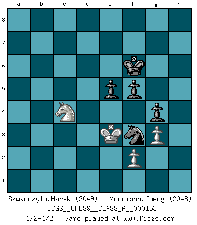 Last move : 1/2-1/2 2015 August 4 13:13:54 [Event "FICGS__CHESS__CLASS_A__000153"] [Site "FICGS"] [Date "2014.07.04"] [Round "1"] [White "Skwarczylo,Marek"] [Black "Moormann,Joerg"] [Result "1/2-1/2"] [WhiteElo "2049"] [BlackElo "2048"] 1.d4 d5 2.c4 e6 3.Nf3 c6 4.e3 Nf6 5.Nc3 Nbd7 6.Bd3 dxc4 7.Bxc4 b5 8.Bd3 Bb7 9.e4 b4 10.Na4 c5 11.e5 Nd5 12.O-O cxd4 13.Re1 g6 14.Bg5 Qa5 15.Nxd4 a6 16.a3 bxa3 17.bxa3 Bg7 18.Bd2 Qc7 19.Rc1 Qb8 20.Nc5 Nxc5 21.Rxc5 O-O 22.Nf3 Rc8 23.Rc1 Rxc1 24.Qxc1 Qd8 25.Qb1 Bc6 26.h3 Bf8 27.Qc2 Qd7 28.Ra1 Nb6 29.Be2 Bb5 30.Qe4 Rc8 31.Be1 Bxe2 32.Qxe2 Qa4 33.Qb2 Nd5 34.Qb7 Qc6 35.Qxc6 Rxc6 36.Bd2 Rc2 37.Kf1 Rb2 38.a4 Kg7 39.Bc1 Rb7 40.Bd2 h6 41.h4 Rb2 42.g3 Bb4 43.Bxb4 Nxb4 44.Ra3 Rc2 45.Rb3 a5 46.Ra3 Rc1+ 47.Ke2 Rc5 48.Kd2 Rc2+ 49.Ke1 Nc6 50.Kf1 Rc5 51.Re3 Rc4 52.Ra3 Re4 53.Nd2 Rxe5 54.Rc3 Nb4 55.Nb3 g5 56.hxg5 hxg5 57.Rc4 Nd3 58.Rd4 Re1+ 59.Kg2 Rd1 60.Kf3 Ne5+ 61.Ke2 Rxd4 62.Nxd4 Nc4 63.Nb3 Kf6 64.Kd3 Nb2+ 65.Ke4 Nxa4 66.Nxa5 Nc5+ 67.Kd4 Nd7 68.Nc4 g4 69.Ke4 Kg5 70.Ke3 f5 71.Kd4 Kf6 72.Nb2 Ne5 73.Ke3 Nf3 74.Nc4 e5 1/2-1/2 Queen's gambit declined Kingside Castling by player White (move 12) Kingside Castling by player Black (move 21) 10 pieces endgame at move 65 : White KNPP , Black KNPPPP WHITE : King + 1 Knight 2 Pawns BLACK : King + 1 Knight 4 Pawns 9 pieces endgame at move 66 : White KNPP , Black KNPPP WHITE : King + 1 Knight 2 Pawns BLACK : King + 1 Knight 3 Pawns This chess game ended in a draw. Follow this game move after move (download)Chess is really ninety nine percent calculation. (Soltis) Jeder leidlich begabte Spieler, er braucht keineswegs hervorragend veranlagt zu sein, kann es zum Meister bringen. Aber das ist ja auch gar nicht nötig! Der richtige Standpunkt ist es, zu seinem Vergnügen zu spielen, und man glaube ja nicht, dass der Genuss proportional dem Können sei. (Siegbert Tarrasch) Yo nunca en mi vida he jugado la Defensa Francesa, que viene siendo la más aburrida de todas las Aperturas. (Wilhelm Steinitz) Il s'avisa de me proposer d'apprendre les échecs qu'il jouait un peu... me voilà forcené des échecs. J'achète un échiquier, je m'enferme dans ma chambre, j'y passe des jours et des nuits à vouloir apprendre par cur toutes les parties. (Jean-Jacques Rousseau, Confessions) Always remember that you are unique; just like everyone else. (Unknown)